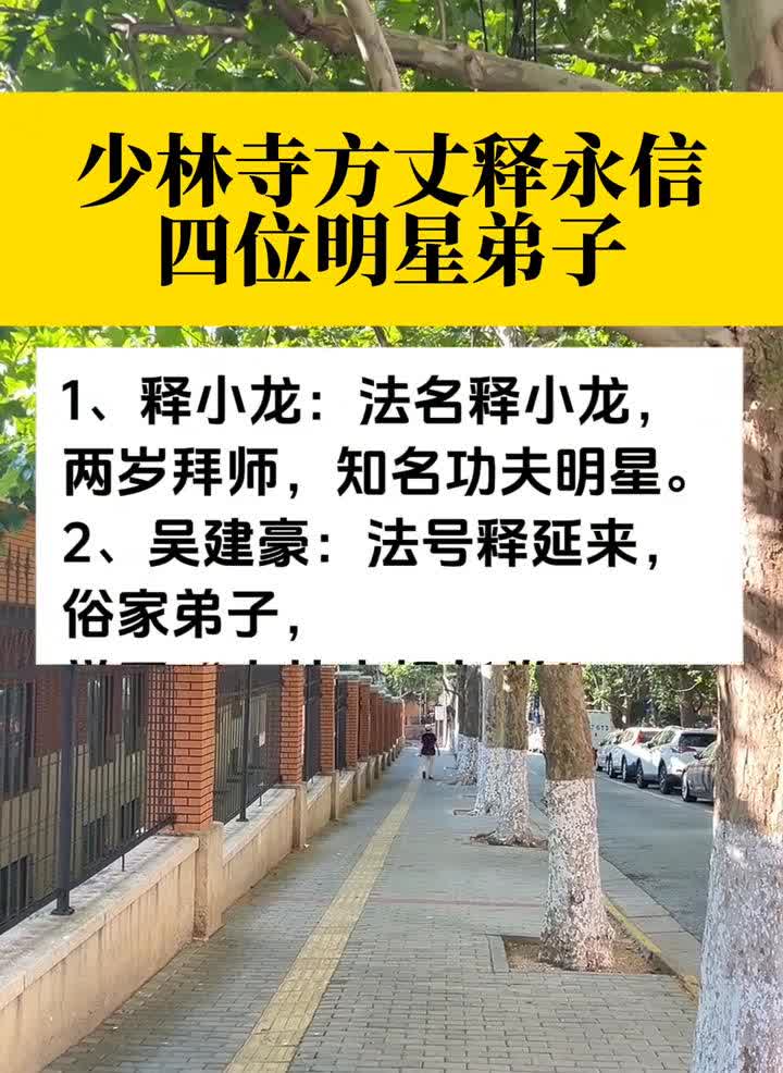少林寺方丈释永信四位明星弟子。 ·1、释小龙:法名释小龙,两岁拜师,知名功夫明星。 ·2、吴建豪:法号释延来,俗家弟子,学了"少林太祖长拳"及"齐眉棍法"。 ·3、李阳:法名延依,河南登封少林寺皈依佛门,为疯狂英语创始人。 ·4、张志磊:法号延晟,WB0世界重量级过渡拳王,少林寺第三十四代俗家弟子。