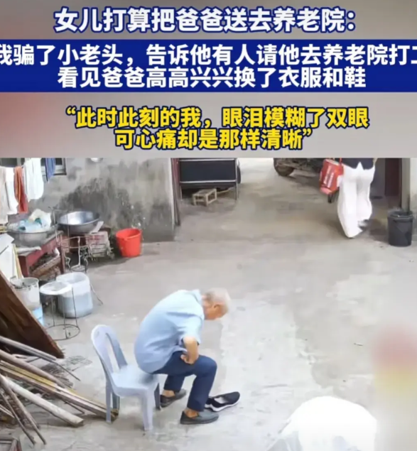 她第一次跟父亲说,被父亲果断拒绝了,可这次,她骗父亲,说给父亲在养老院找了份工作。父亲信以为真,高兴的换上新鞋新衣服,以为是去工作呢! 可这一骗去,想出来估计就难了。
