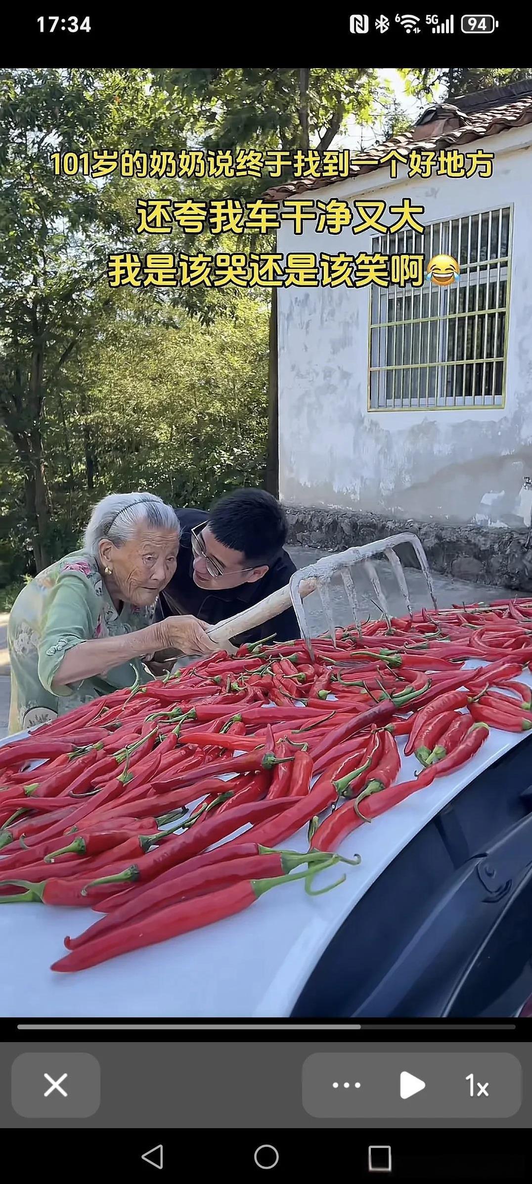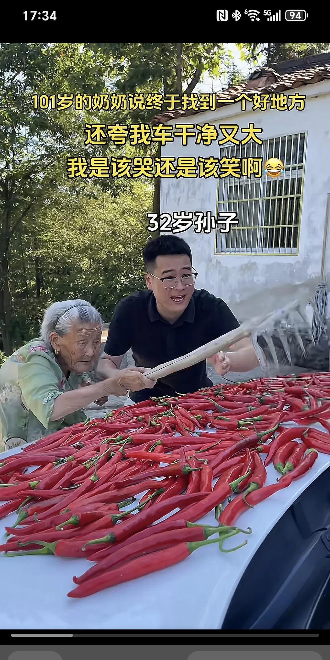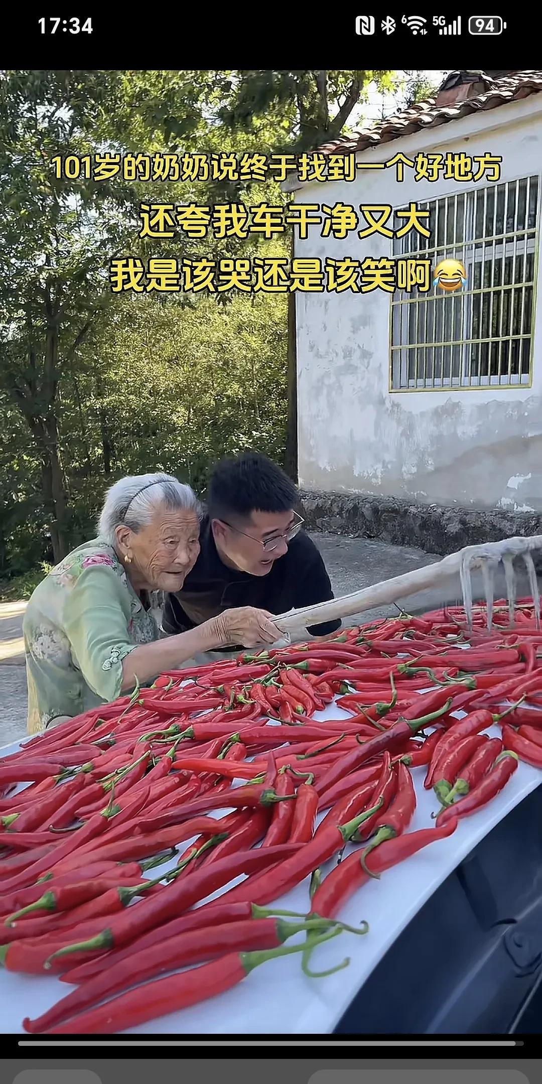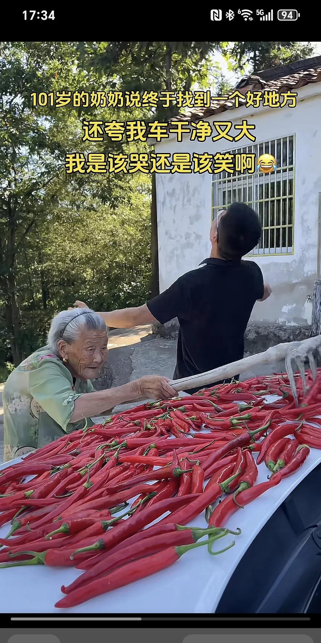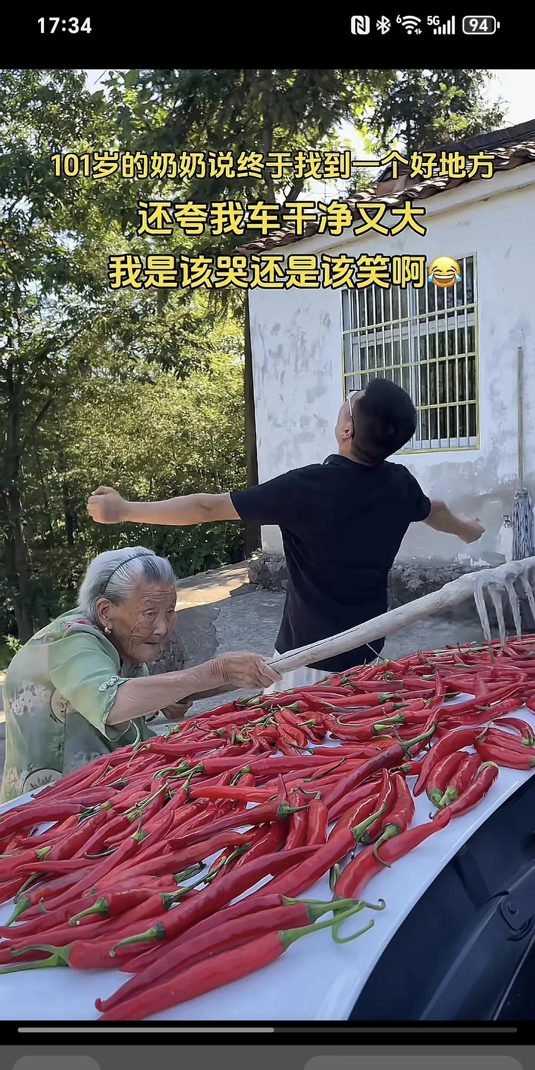 101岁的奶奶说终于找到了一个好地方,还夸我车干净又大,我是该哭还是该笑啊~ 奶奶的辣椒今年大丰收,一直担心没地方晒,今天早上总算找到了个好地方,我是该哭还是该笑。 晒辣椒就晒了吧,但吓人的是奶奶还用铁耙耙在车上耙来耙去的,孙子想哭又想笑无语呀。 这大椒嗮一天是一天,能嗮是老人家福气,有的车子比这个好的多了,但是,他们能有这样的老奶奶来嗮辣椒吗?但愿老人长寿康泰,仁厚之家,必有余庆!