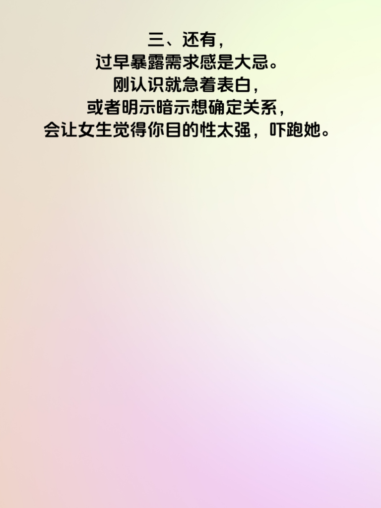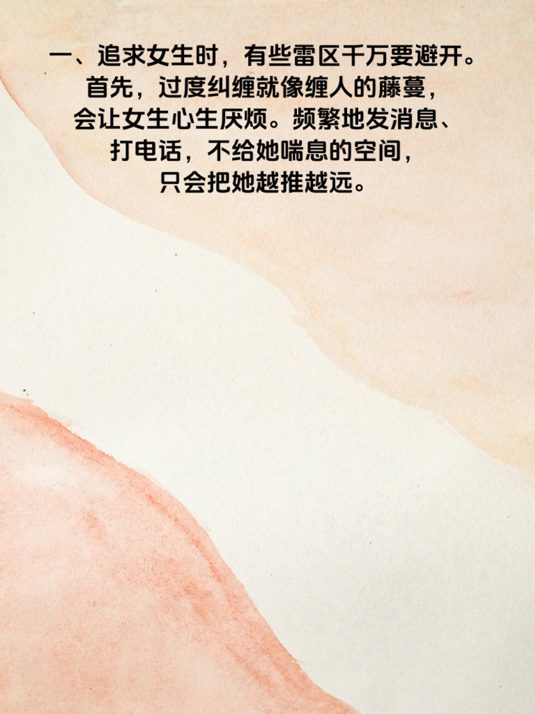 一、追求女生时,有些雷区千万要避开。首先,过度纠缠就像缠人的藤蔓,会让女生心生厌烦。频繁地发消息、打电话,不给她喘息的空间,只会把她越推越远。 二、不懂尊重她的想法和感受也很危险。每个人都有自己的观点,若总是强行把你的想法加给她,她会觉得你不理解她,进而对你关上心门。 三、还有,过早暴露需求感是大忌。刚认识就急着表白,或者明示暗示想确定关系,会让女生觉得你目的性太强,吓跑她。 四、另外,在她面前过度吹嘘自己,炫耀财富、成就等,只会让她觉得你虚荣又浮躁。真诚才是打动她的法宝。 五、追女生要步步为营,用心去了解她,尊重她,用真诚和耐心慢慢靠近她,绕开这些雷区,才能收获美好的爱情。