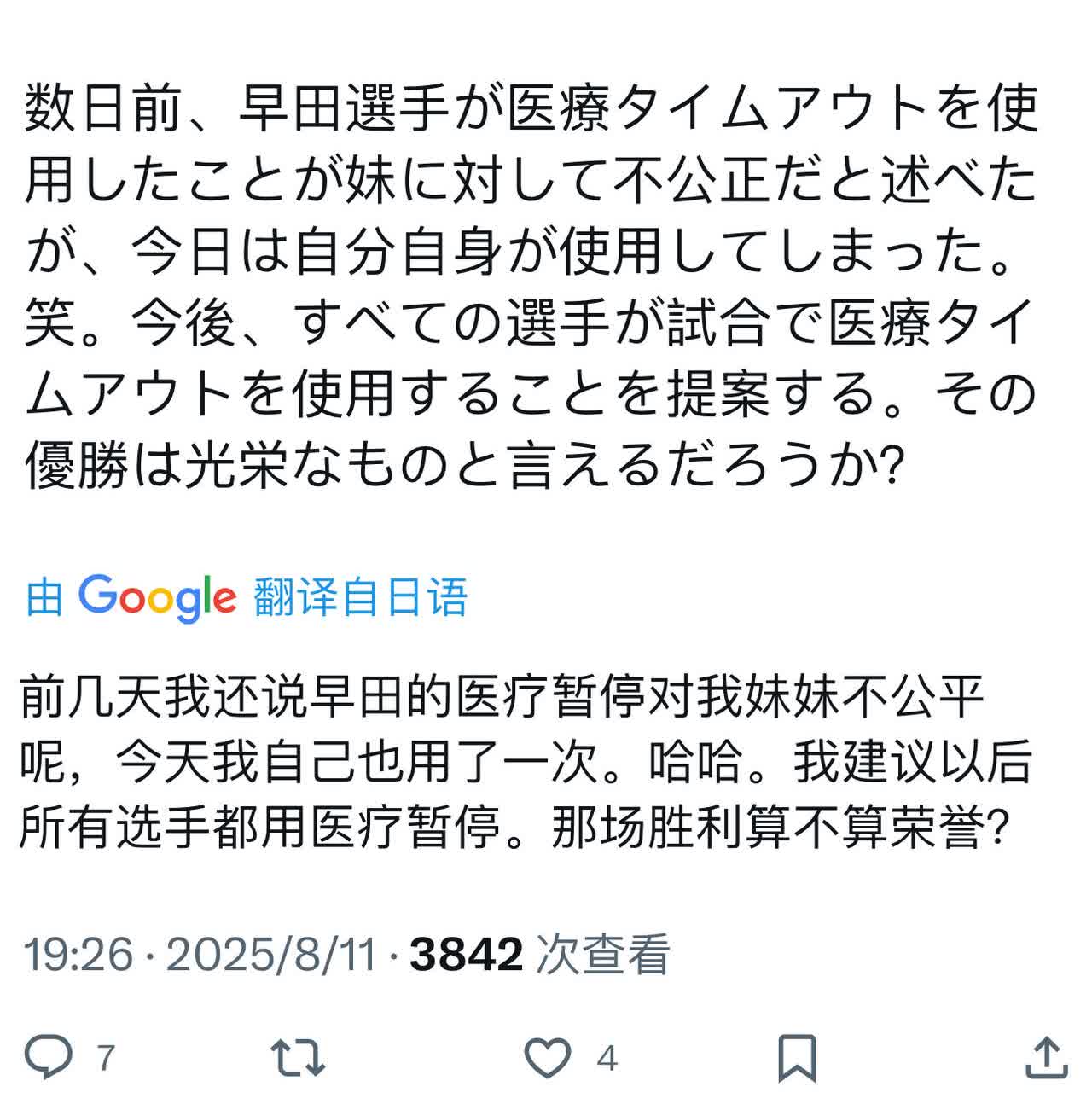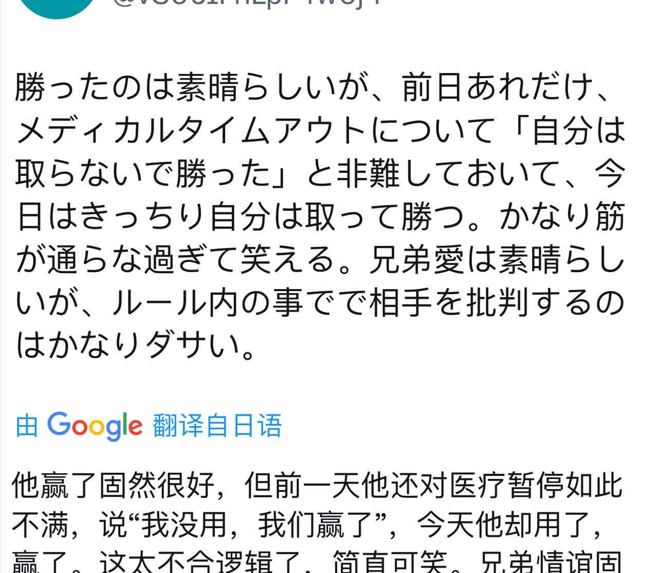 张本“医疗暂停”,日乒球迷“揭露”他“虚伪” 有日乒球迷说:前几天他还说,早田的医疗暂停对我妹妹不公平呢,今天自己也用了一次。哈哈。我建议以后所有选手都用医疗暂停。那场胜利算不算荣誉? 还有日乒球迷说:他赢了固然很好,但前一天他还对医疗暂停如此不满,说“我没用,我们赢了”,今天他却用了,赢了。这太不合逻辑了,简直可笑。兄弟情谊固然好,但因为规则允许的事情批评对手,实在太没良心了。 张本这做法:看来日乒球迷都看不下去了,各位怎么看?