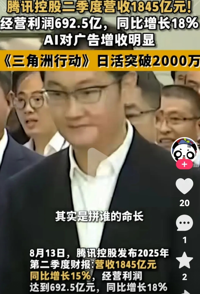 腾讯二季度营业收入1845亿元 经营利润692.5亿,同比增长18% 这数据逆天了 完全看不出来经济下行 腾讯是真牛,不是假牛 中国民营企业中 如果光说利润这一块,直接是天花板啊 这小马哥可以直接跳街舞了 直接来一套连环后翻了 图片来自环球网视频