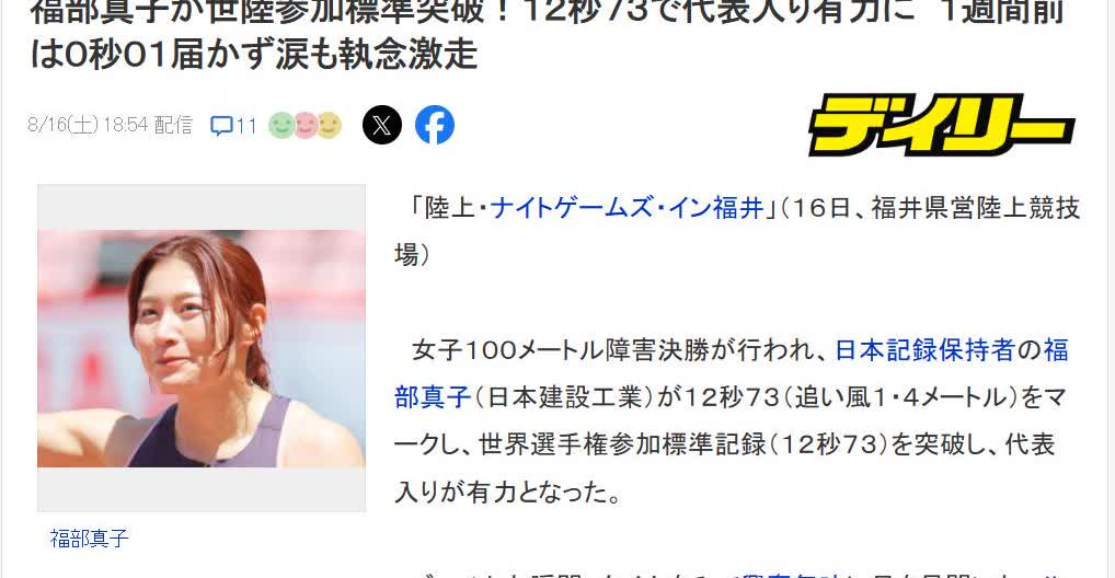 日本女子100米栏获得东京田径世锦赛满额门票,而中国只有吴艳妮一个名额,而且这个名额还有失去的可能,如果吴艳妮积分跌出前40名的话。福部真子在最新的比赛跑出12秒73,达到12秒73参赛标准,直通世锦赛,上周她还因为12秒74无法直通痛哭。此外,中岛瞳以12秒71的成绩早已经直通,田中佑美通过积分也已经上岸,日本女子短跨史上首次获得世锦赛三个满额席位,再次印证中国女子100米栏整体水平不如日本。