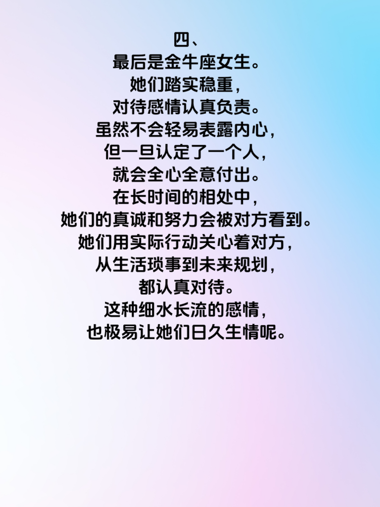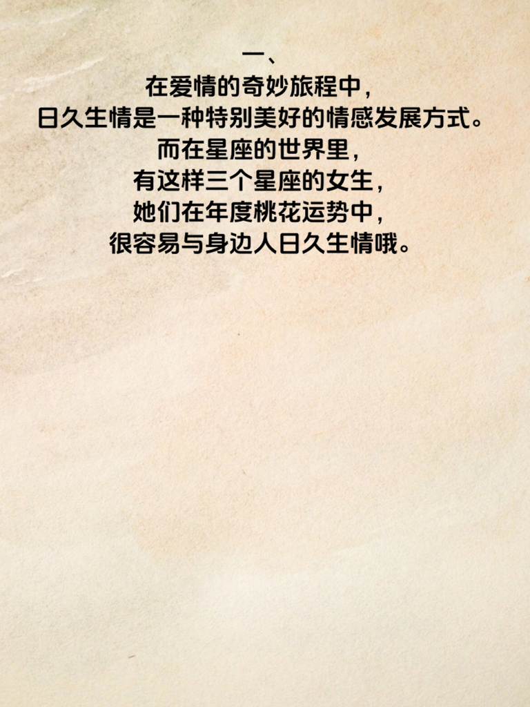 一、在爱情的奇妙旅程中,日久生情是一种特别美好的情感发展方式。而在星座的世界里,有这样三个星座的女生,她们在年度桃花运势中,很容易与身边人日久生情哦。 二、首先是巨蟹座女生。她们心思细腻,情感丰富且极具包容性。当一个男生长时间与巨蟹座女生相处,会发现她们的温柔体贴如涓涓细流,慢慢渗透到生活的点滴。她们会记住你不经意间说的话,关心你的喜怒哀乐。在日复一日的相处中,这种温暖的关怀会让感情逐渐升温,很容易就发展出深厚的情谊。 三、接着是双鱼座女生。她们浪漫且充满幻想,对感情有着极高的期待。在长期的相处里,她们会被男生的一个小举动、一句贴心话所打动。她们眼中的爱情是美好的童话,与她们相处,你会感受到那种梦幻般的氛围。久而久之,这份浪漫会让她们不知不觉地陷入爱情,日久生情也就水到渠成。 四、最后是金牛座女生。她们踏实稳重,对待感情认真负责。虽然不会轻易表露内心,但一旦认定了一个人,就会全心全意付出。在长时间的相处中,她们的真诚和努力会被对方看到。她们用实际行动关心着对方,从生活琐事到未来规划,都认真对待。这种细水长流的感情,也极易让她们日久生情呢。