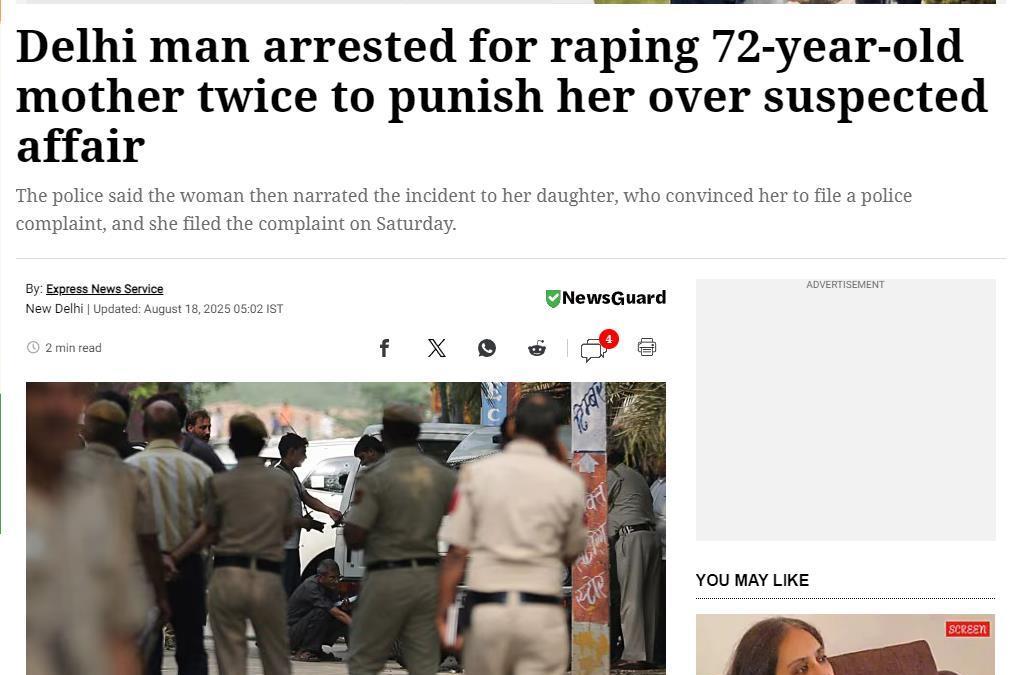 印度39岁男子将72岁母亲强奸 母亲报警将其送入监狱 印度媒体18日披露了发生在该国的一起令人震惊的恶性案件:印度警方证实称,该国一名39岁的男子涉嫌两次强奸其72岁的母亲,于当地时间周六被捕。 印度中央警察局副局长尼丁·瓦尔桑(NidhinValsan)表示:“被告目前处于失业状态,案件的调查仍在进行中。”印度警方称,这名男子之所以这么做,是因为他怀疑她在他小时候有外遇。 据警方介绍,这名72岁老人与丈夫、儿子和女儿住在德里中部。该女子告诉警方,她最近与丈夫和女儿前往沙特阿拉伯朝圣。据一名警官称,被告男子随后打电话给他的父亲,并告诉他应该与她离婚,因为她“品行不端”。 该警官说,“8月1日,当他们从沙特返回德里时,她的儿子袭击了她,并试图再次袭击她,之后她去了大女儿的家。” 警官根据她的投诉继续说道,“8月11日,该女子回到家中。她的儿子告诉家人,他想私下和母亲谈谈,因为这是私事。据称,他随后将她带进一个房间,用刀威胁她,并强奸了她。” 这名警官补充道,“她吓坏了,出于羞耻,没有告诉任何人,”但是据称三天后,他再次强奸了她。 警方称,该72岁老人随后向女儿讲述了这一事件,女儿说服她向警方报案,于是她最终选择了报案。