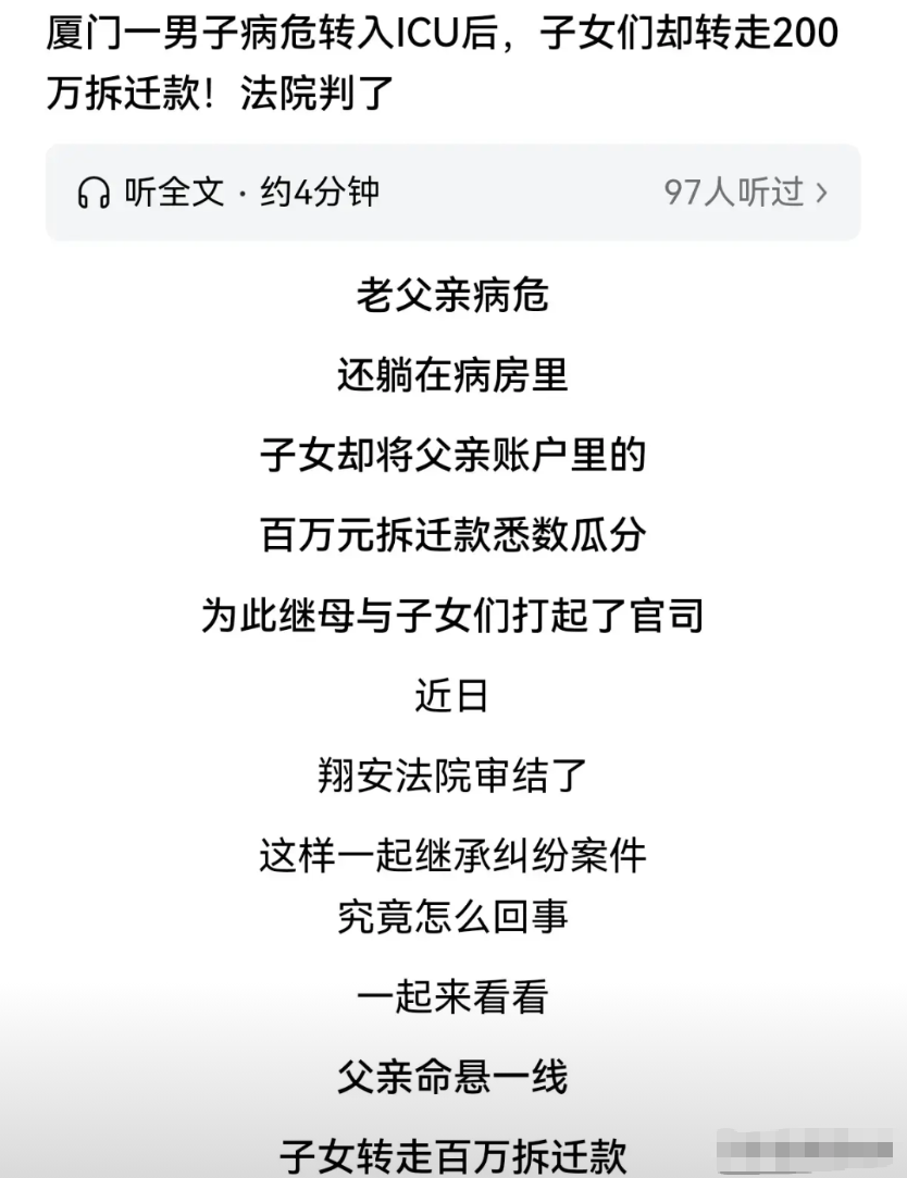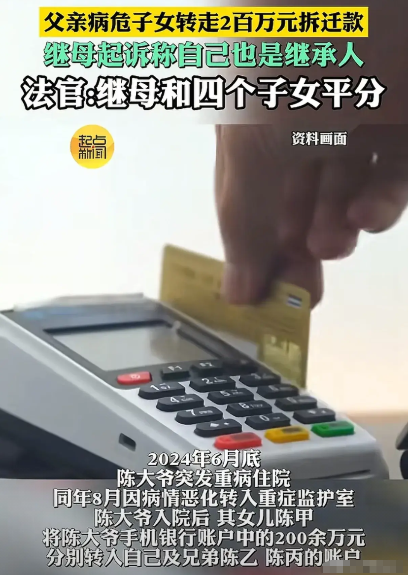 福建厦门,女子和男子结婚5年,男子家的房屋拆迁,获得数百万补偿款,男子给她买了一套180万的房子,并公证为她个人所有,还分了200余万元拆迁款给她。2年后,男子病重住院,3名子女担心继母拿走父亲的全部积蓄,悄悄把老人卡内的200万转走。女子发现后,认为这是自己和丈夫的共同财产,3名继子女无权处分,将3人告上法庭,要求把200万拿出来,法院判了。
