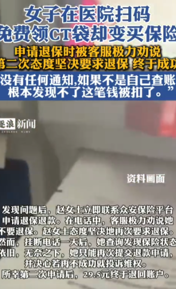 脸都不要了!”山西太原,一女子陪同妹妹到医院做CT检查,做完CT检查,因为需要袋子来装片子,用旁边扫码免费领取袋子的机器,领取了一张,可万万没想到,女子回家查账时发现自己购买了一份保险,这是在在自己不知情的情况下购买了的,且这份保险只是首月优惠!于是立刻找客服,客服却极力劝说不要退保,最后还是女子连续两次坚决要求才成功! 据逐浪新闻8月13日报道,太原的赵女士和妹妹在医院放射科外排了很久的队,等到CT检查结束。 赵女士夹着沉甸甸的片子在大厅里穿梭,心里只想着尽快回诊室找医生看片。