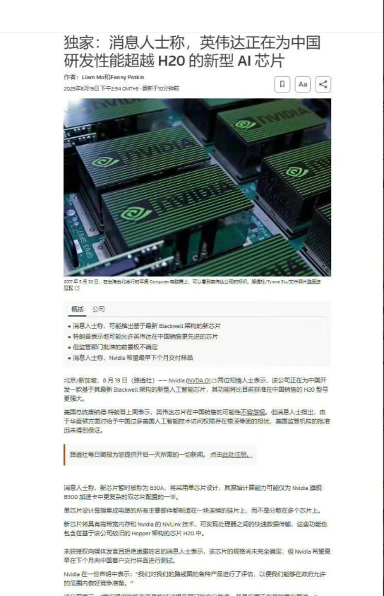 .英伟达,承认了!路透社刚爆出来的猛料英伟达高层内部敲定,要给中国重新定制