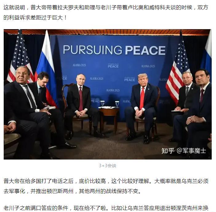 难怪普大帝在阿拉斯加就只待了半天,连午饭都没吃就回去了! 感情卢比奥在旁边这样顶,话不投机半句多! 卢比奥,之前就已经写到过很多次了,属于建制派的人,极大可能就是梅隆家族当时支持老川子之后塞过来的人,它不仅阻止马斯克对联邦体系进行大规模裁员,就是为了保全深层政府在联邦体系内的触角。同时它也阻止对俄罗斯过分亲热,卢比奥和那位主持人防长,也同时是反俄的。 这不,这次美俄在阿拉斯加会晤,卢比奥的第一个要求就是——美利国并不支持将顿巴斯领土交给俄罗斯! 所以,老川子答应的那些条件,那都是老川子答应的,关美利坚内阁什么事!特朗普答应的事,你去找特朗普要,你不能找美利坚要,因为美利坚的决策得美利坚内阁同意。 卢比奥大概就是这么个意思! 美俄会谈,一开始1+1,老川子和普大帝在防弹车上聊。聊完了,必须3+3带上卢比奥的时候,卢比奥就出来紧皮了! 整场阿拉斯加会晤,卢比奥就是负责当恶人的,老川子是负责唱白脸的! 就这,果然是ZZ层面的利益划分就谈崩了。所以,代表团扩大会谈,直接吹掉! 而这,前面的那篇长文就已经说了[机智]