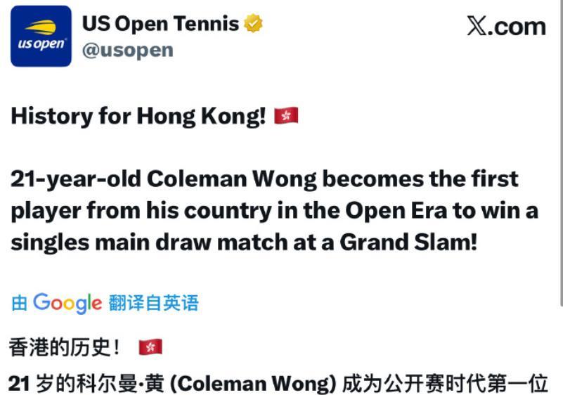 才看到!昨晚美网官推发了黄泽林,把香港说成了国家!后来已经删了重发。 现场好多香
