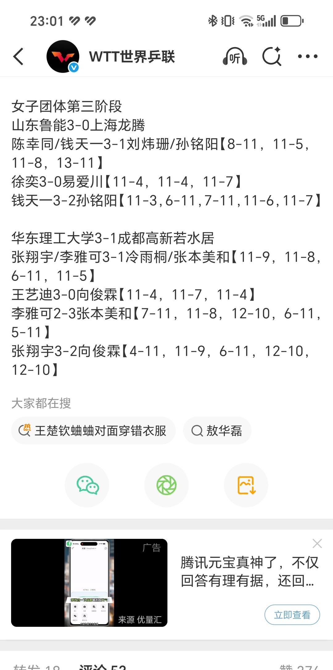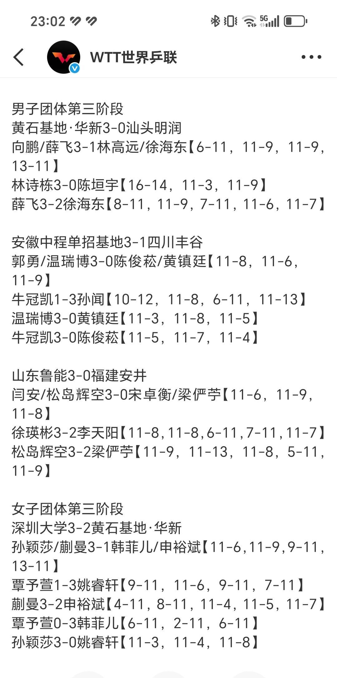 8月30日乒超第三阶段比赛情况表,王楚钦劳模,场场参加比赛很努力。温瑞博受伤是意外,感觉比赛还是得以身体健康最重要。孙颖莎今天参加了上半场比赛,两战两胜。 山东鲁能两场比赛王曼昱都没上场有点意外。 汕头明润林高远带着陈垣宇和徐海东感觉打的还是很不错的。 这次黄石林诗栋带着薛飞和向鹏感觉实力很有夺冠的气质。 乒超最看好的山东魏桥,上海地产但是没有樊振东赢很难,黄石今年乒超很亮眼。
