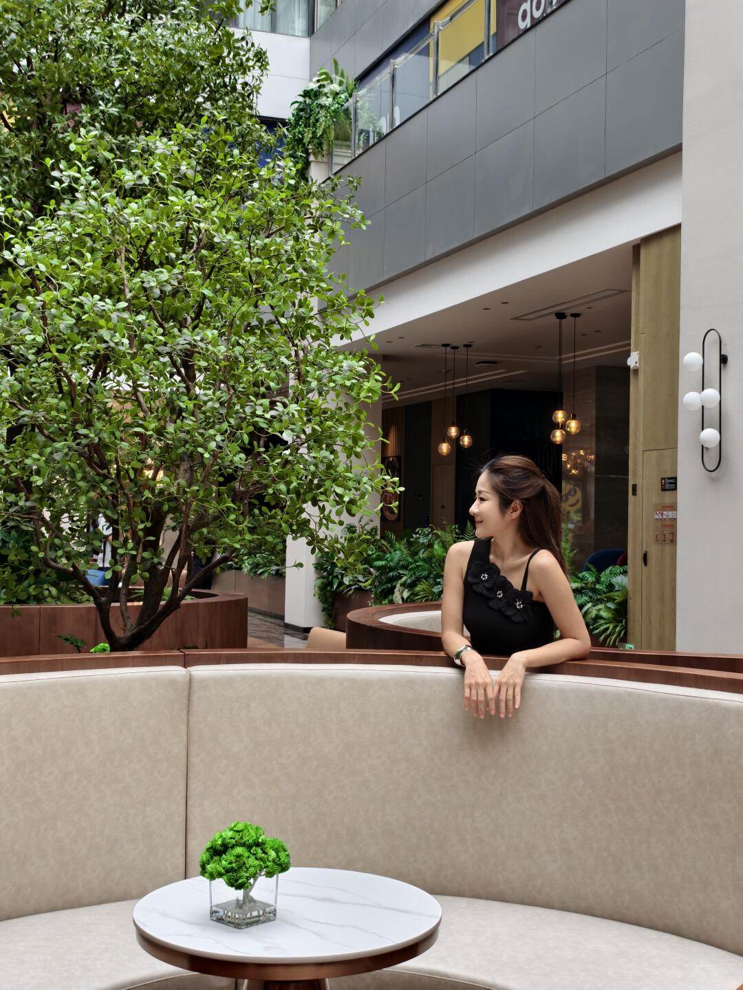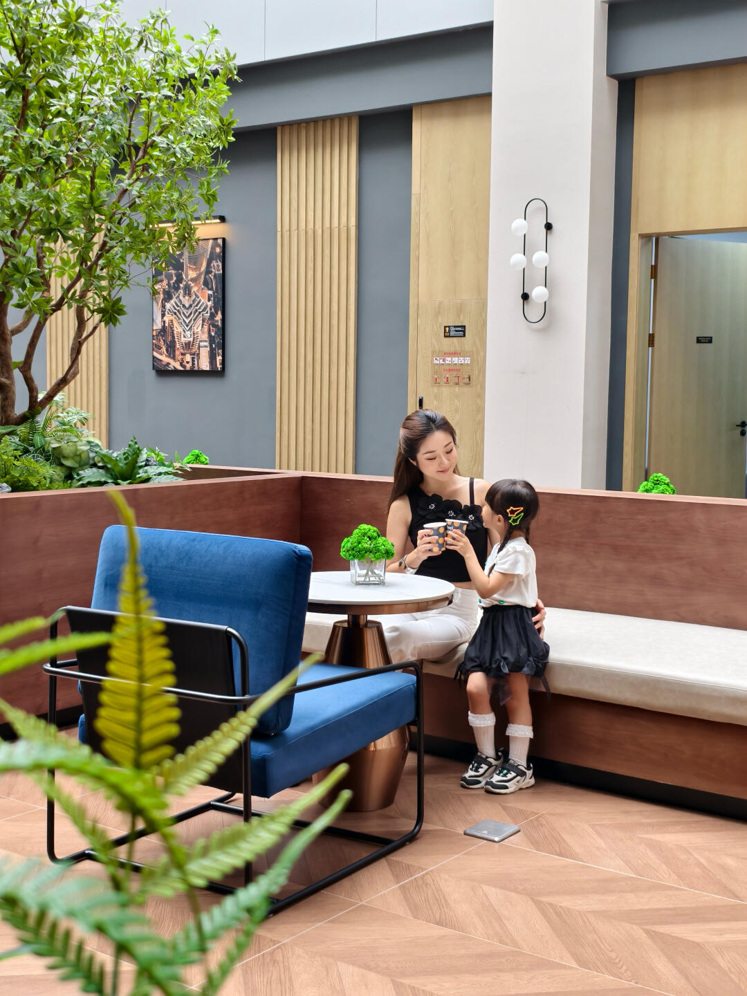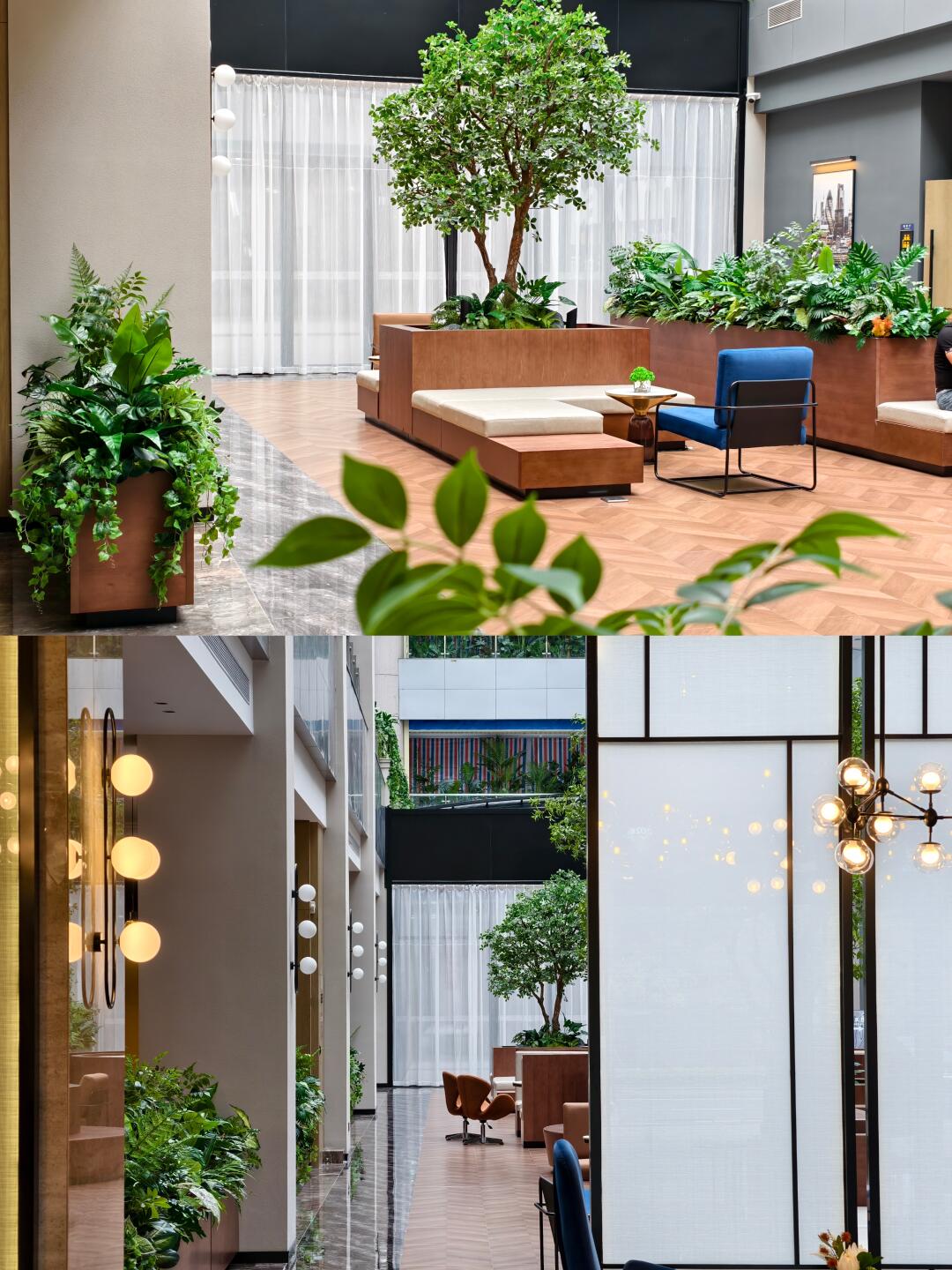 突然明白这才是酒店让人有回家感觉的贴心!这些细碎的瞬间,像春天的风一样,不刻意却让人觉得舒服。在房间拍了几张照片,暖黄的灯光下,都觉得好温馨呢!一楼公区也有城市绿洲的感觉,菲宝在这里跑跳得可开心了!