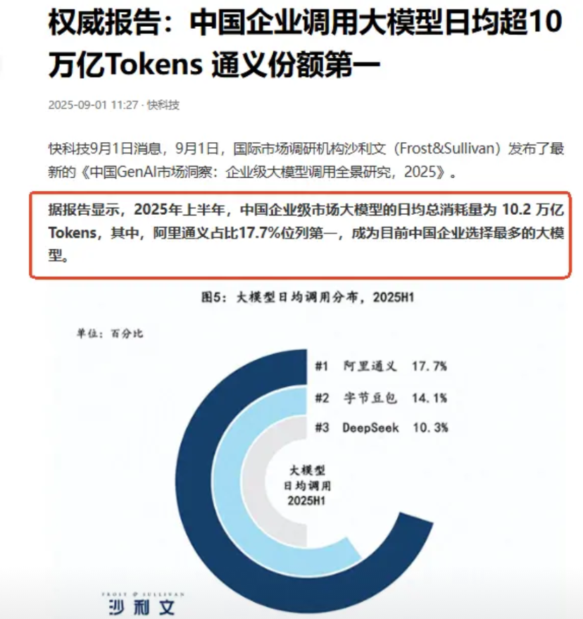 如果不是这份权威报告曝光,恐怕很多人都还蒙在鼓里,原来阿里巴巴已经拿下第一! 看到国际市场调研机构沙利文发布的一份最新报告,今年上半年,中国企业级市场大模型的日均消耗总量为10.2万亿Tokens,其中阿里通义以17.1%的份额占据第一,成为中国企业使用最多的大模型。 大家要明白一点,大模型的真正机会在企业级市场,中国做大模型最应该抓住产业发展的机会。因为只有企业为大模型付费,才会让整个中国AI产业有良性盈利,才能形成一个从科研投入到落地应用的正向循环。可以说,谁先能在企业级市场取胜,谁才更可能是最后的赢家。 而阿里通义能在企业级市场拔得头筹,并不让人意外,毕竟阿里在开源大模型领域的领先地位是无可争议的。像7月下旬,N款模型连发,接连斩获了多个主流领域的全球开源冠军。 到现在,阿里通义已经开源300多款模型,实现了全尺寸、全模态的开源,且拥有非常广泛的应用场景,比如代码开发、硬件制造、汽车、金融等行业都在接入阿里通义系列大模型, 甚至就连部分海外科技企业也看中了阿里通义的高性能 之前美国AI芯片巨头英伟达就以阿里通义为基础底座,推出了多款微调模型,实测表现非常出色。 这些无不说明,如今中国在AI发展有了足够的底气,过去几次生产力变革,我们错失良机,但这次我们不会缺席。以阿里通义为代表的中国开源大模型,正在帮助中国企业、行业在AI时代完成转型升级。 哪怕是在国际竞争上,中国AI与日俱增的实力,也让我们无惧任何对手。