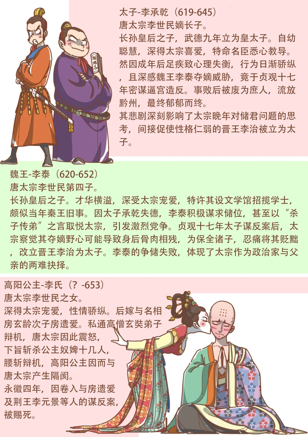 晚辈:子-太子李承乾;子-魏王李泰;女-高阳公主;子-高宗李治;妾/儿媳-武则天