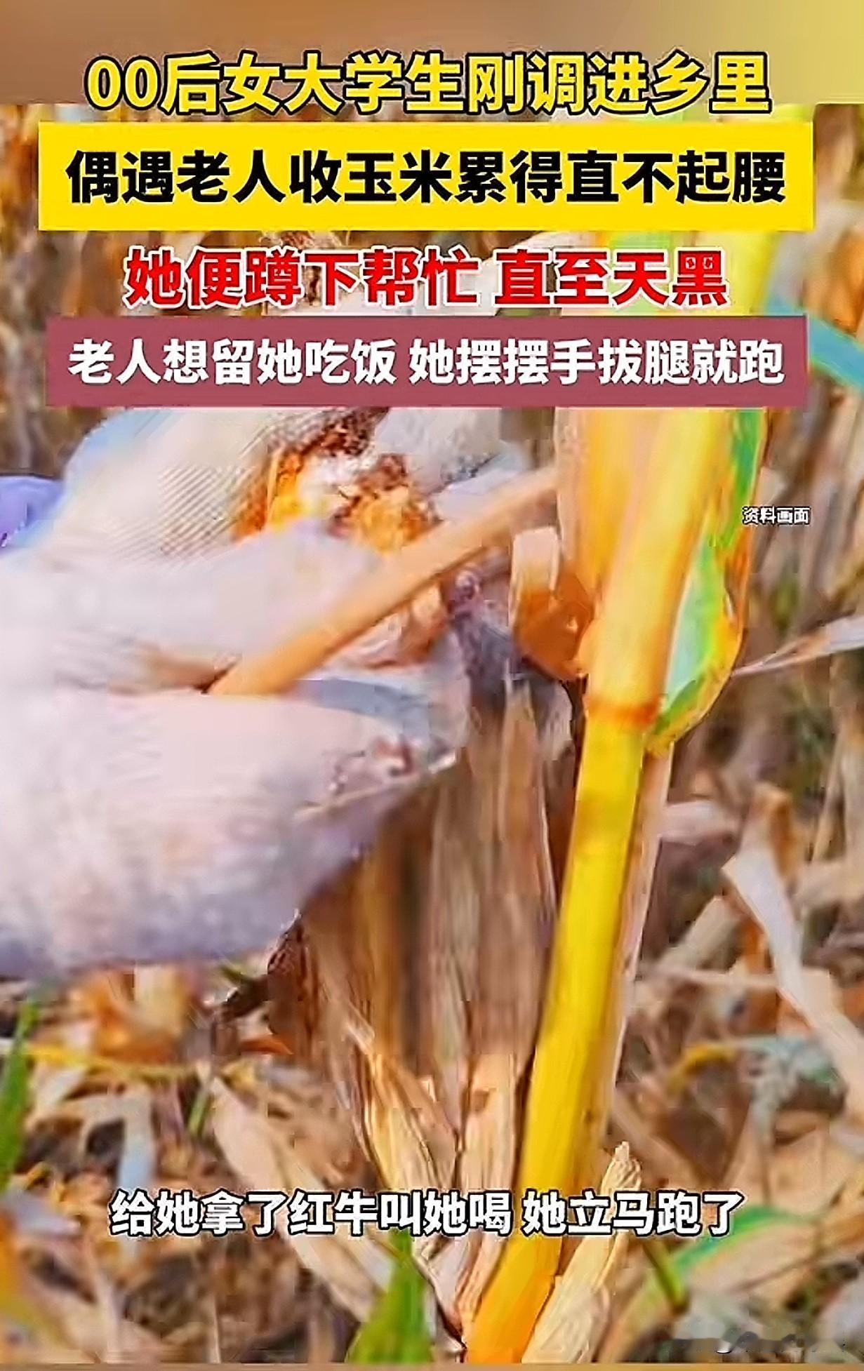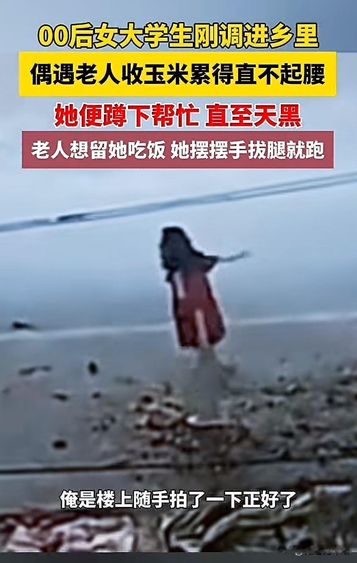 “这姑娘太招人稀罕了!”河南开封的玉米地里,一位00后女大学生帮一位大妈收玉米,一直忙到天黑。大妈想留她吃饭,结果这姑娘谢绝后转身就走,这件事让很多人觉得特别暖心。 说实话,这姑娘就是下班路过,看见大妈一个人在忙,想都没想就上前帮忙。从下午一直干到晚上,衣服都被汗浸透了,手也被玉米叶划了几道口子。大妈过意不去想请她吃饭,她却摆摆手就快步离开了。后来才知道,她在乡政府工作,觉得帮忙是应该的,吃饭反而会觉得不好意思。 要我说啊,这代年轻人真的不是大家说的那样。他们会在菜市场帮摊主搬货,疫情期间主动去当志愿者,现在又出现在田间地头帮忙。干完活说走就走,不图别人感谢,也不为拍视频炫耀,这种纯粹的善意挺难得的。 我觉得最好的帮助就是这样,不刻意、不张扬,就像顺手帮个忙。这种帮完就走的“闪电式”善意反而特别真实。年轻人用实际行动告诉我们:做好事其实可以很简单,不用想得太复杂。 那个匆匆离开的姑娘可能没意识到,她这简单的帮忙举动,恰恰展现了年轻人最好的模样。
