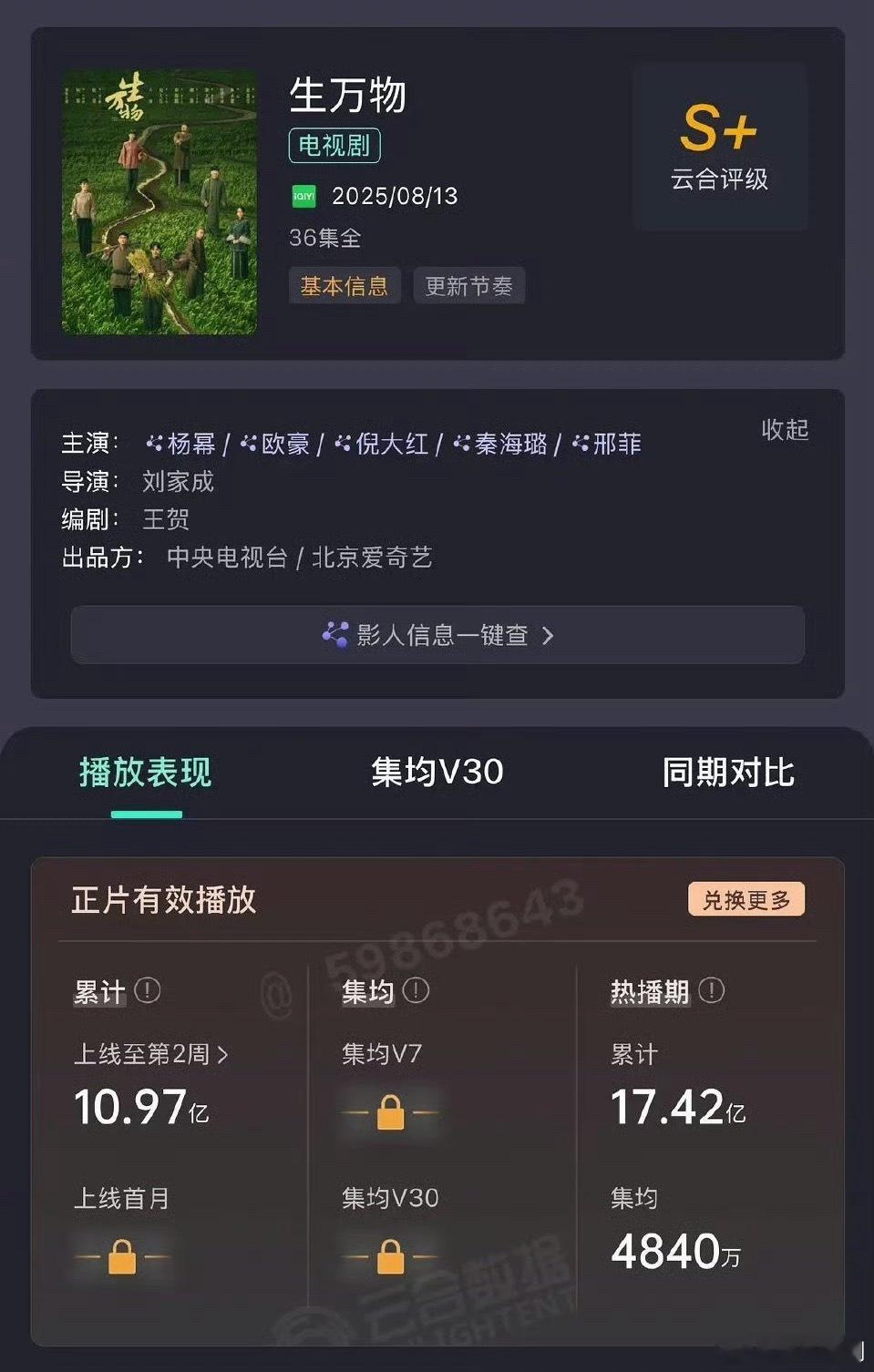 杨幂主演的生万物 云合热播集均4840万,三集连播远超预期。《生万物》各项数据均非常亮眼,好久没有看到这么无短板的爆剧了~