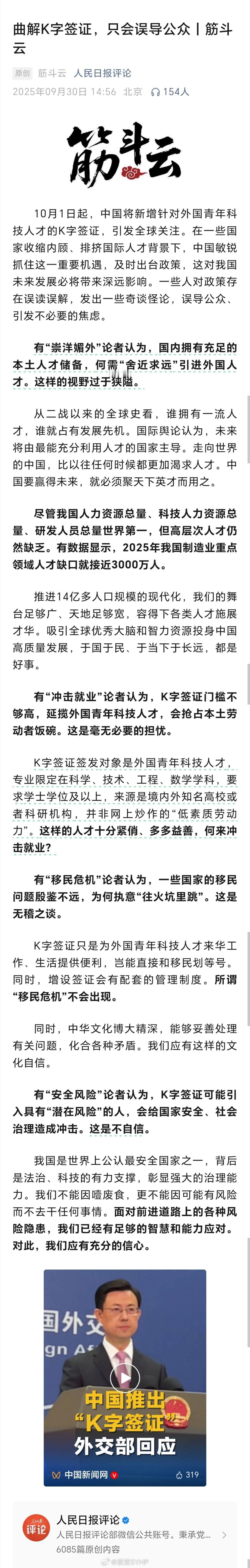 10月1日起,中国将新增针对外国青年科技人才的K字签证,引发全球关注。在一些国家收缩内顾、排挤国际人才背景下,中国敏锐抓住这一重要机遇,及时出台政策,这对我国未来发展必将带来深远影响。一些人对政策存在误读误解,发出一些奇谈怪论,误导公众、引发不必要的焦虑。