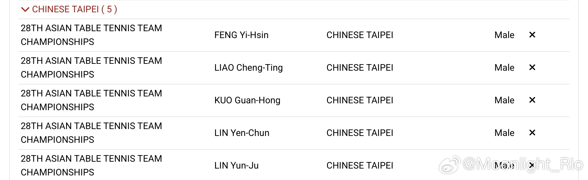 亚锦赛中国台北队男团名单更新高承睿替换为冯翊新