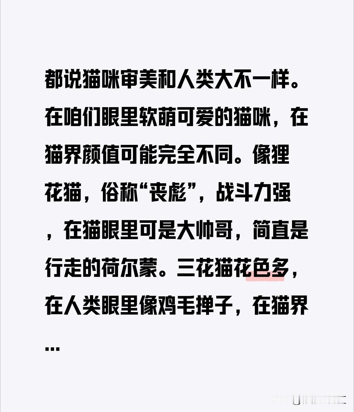 都说猫咪审美和人类大不一样。在咱们眼里软萌可爱的猫咪,在猫界颜值可能完全不同。