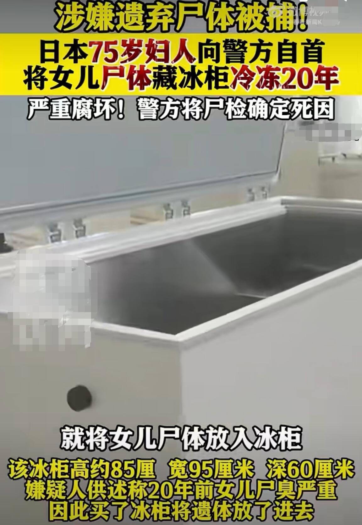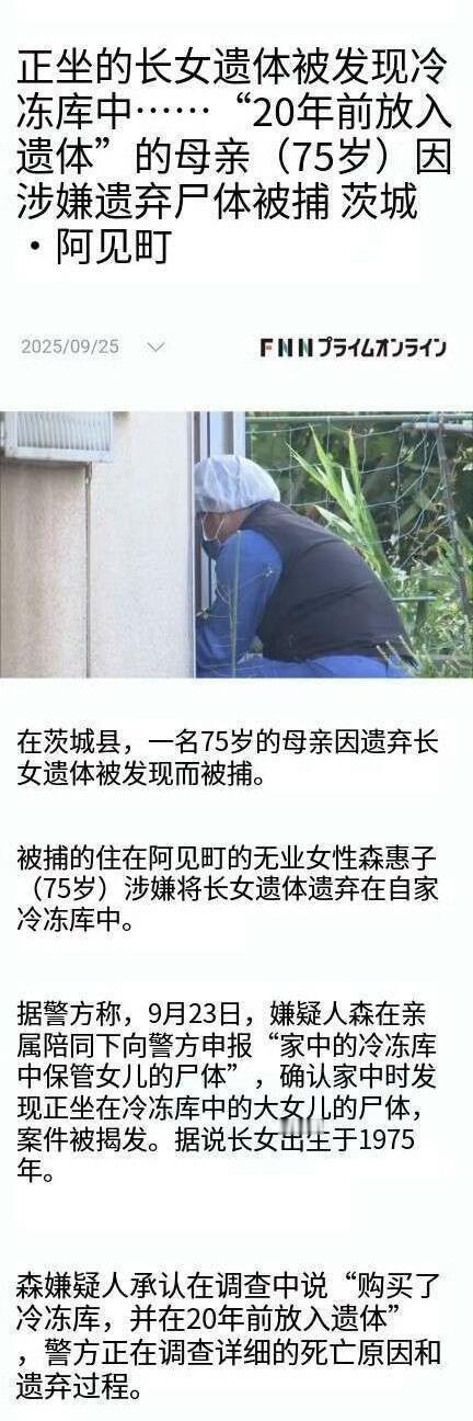 这事儿听得人后脖子发凉。日本75岁的森惠子,揣着个秘密过了二十年,最后自己走进警局说:“我女儿的尸体,在冰箱里放了二十年。” 警察一进门,在她家厨房冰柜里真找着了遗体,蜷成跪坐的姿势,盖着毛毯,周围塞了不少除臭剂,就是为了压味儿。这冰柜就杵在日常做饭的地方,二十年来,她跟丈夫、婆婆就在旁边正常过日子,邻居都不知道她有过女儿,只觉得她是个爱种花的温和老人。 更吓人的是,后来解剖发现,她女儿不是自然死亡,脖子有勒痕,头上还有钝器伤,明显是被人害的。森惠子自己也说,当年家里有矛盾。现在丈夫、婆婆都死了,就剩她一个人扛不住了,才说了实话。 这哪是“守护”,分明是藏着见不得光的事。日本这种事还不少,有藏母亲遗体十年骗房租的,有老人在家死俩月才被发现的,全是老龄化社会的毛病。 法律上,她犯了遗弃尸体罪,最多能判三年,但她年纪大了,最后怎么判不好说。可比起判刑,更让人难受的是那种“表面太平”。邻里看着和睦,家里却藏着人命秘密;社会看着有序,底下全是孤独和藏不住的矛盾。 这冰柜冻住的不只是一具遗体,更是一个家的扭曲和一个社会的冷漠。你永远不知道,那些看着最普通的笑脸背后,藏着多吓人的秘密。