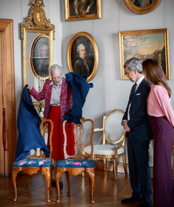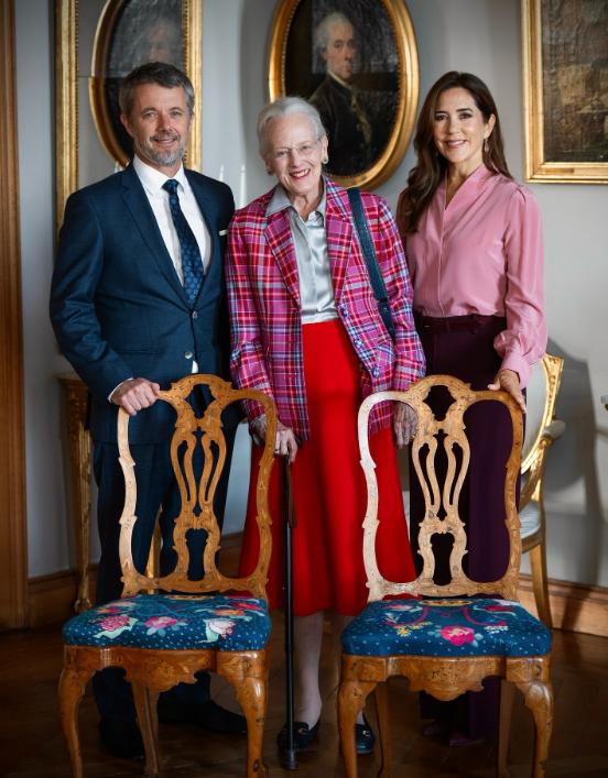 退休女王玛格丽特二世送给儿子儿媳两把椅子,合影中身体靠向了腓特烈十世,肢体语言中