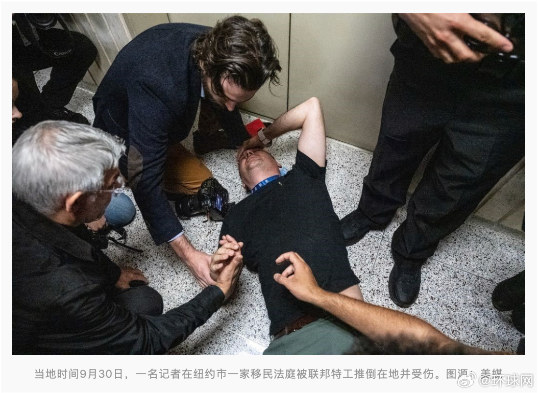#美特工推搡打伤记者##纽约州长谴责ICE特工推搡记者#【美国混乱一幕:记者在纽约法庭被ICE特工推倒在地,纽约州长、美国土安全部发声】据美国有线电视新闻网(CNN)、《纽约时报》等媒体报道,纽约市曼哈顿一家移民法庭当地时间周二(9月30日)发生混乱一幕:多名记者在大楼内电梯处被美国移民与海关执法局(ICE)特工推搡,一名记者甚至直接被推倒在地,事件最终导致至少一名记者受伤。事发后,纽约州州长霍楚尔对此事予以谴责,ICE上级部门——美国国土安全部也就此发声。