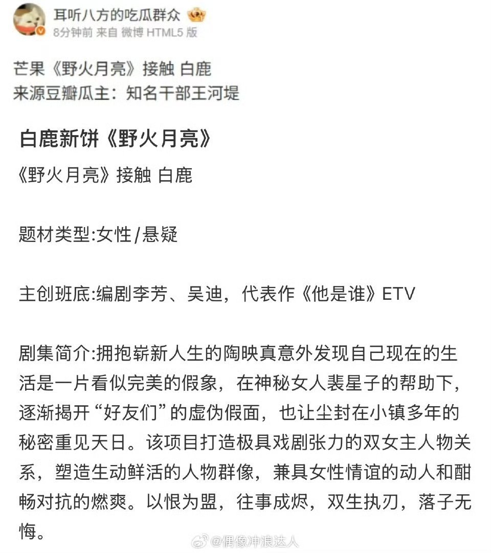 网传野火月亮主演是白鹿[期待][期待]姐之前说自己想演悬疑剧,结合之前说的“一般