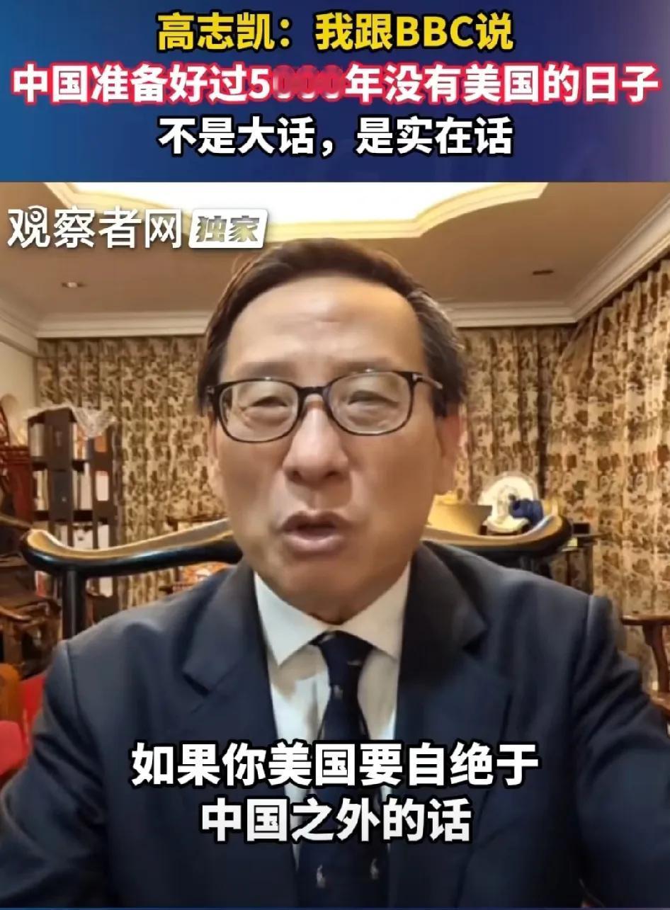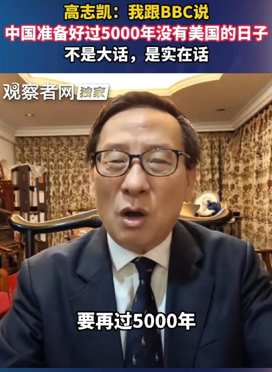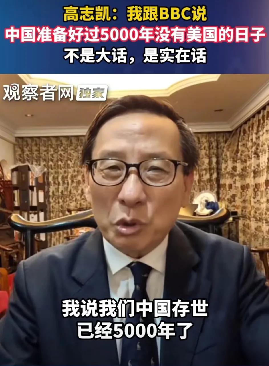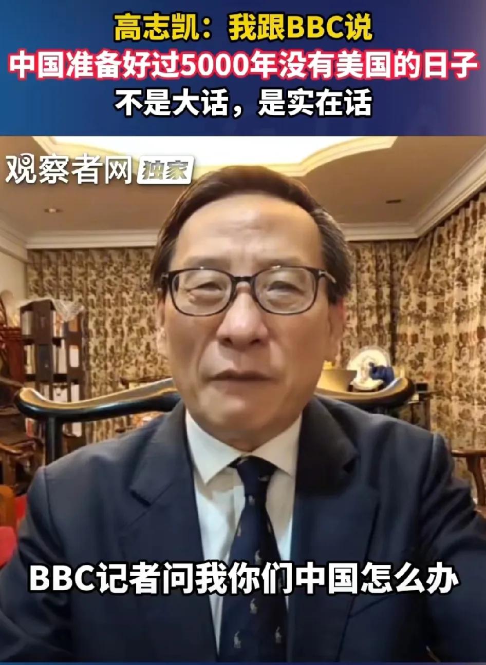 高志凯:中国已经准备好再过5000年没有美国的日子。这不是大话,这是实话。 美国向中国发动关税战最厉害的时候,BBC的记者问了高志凯一个问题。这个问题是:中国出口到美国的产品占中国总出口额的15%,如果这15%的市场全丢了,中国将如何应对? 他的言下之意,就是中国如果没有了美国市场,就会血流成河,溃不成军,经济崩溃! 对此高志凯给出的回答,可以称得上是石破天惊!也只有高先生这样的人,才能想得出如此既具有思辨性,又具有战斗力,同时又具有历史底蕴的回答来。 高志凯是这样回答BBC的记者的,他说:我们不在乎!中国已经存世5000年了,绝大部分时间没有美国什么事,我们照样活下来了。如果美国要欺负中国,如果美国要自绝于中国的话,那中国就做好准备,再过5000年没有美国的日子! 就问你高志凯的这个回答过不过瘾?解不解气?提不提神?爽不爽? 这个世界上,有没有美国对中国来说真的不重要。没有美国的那5000年,中国人照样创造了无数人类文明史上的辉煌。在接下来的时代,中国同样不会介意再过5000年没有美国的日子,甚至更长! 美国人,你听懂了吗?不服的话,只管放马过来,想打什么战,中国都奉陪到底!一定会让你知道如何做人!
