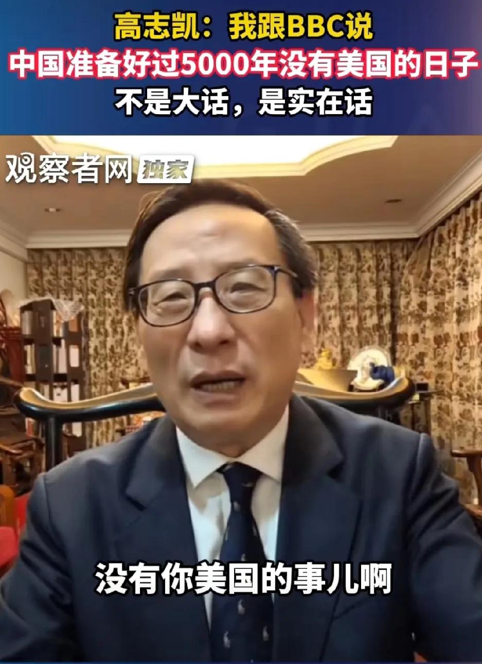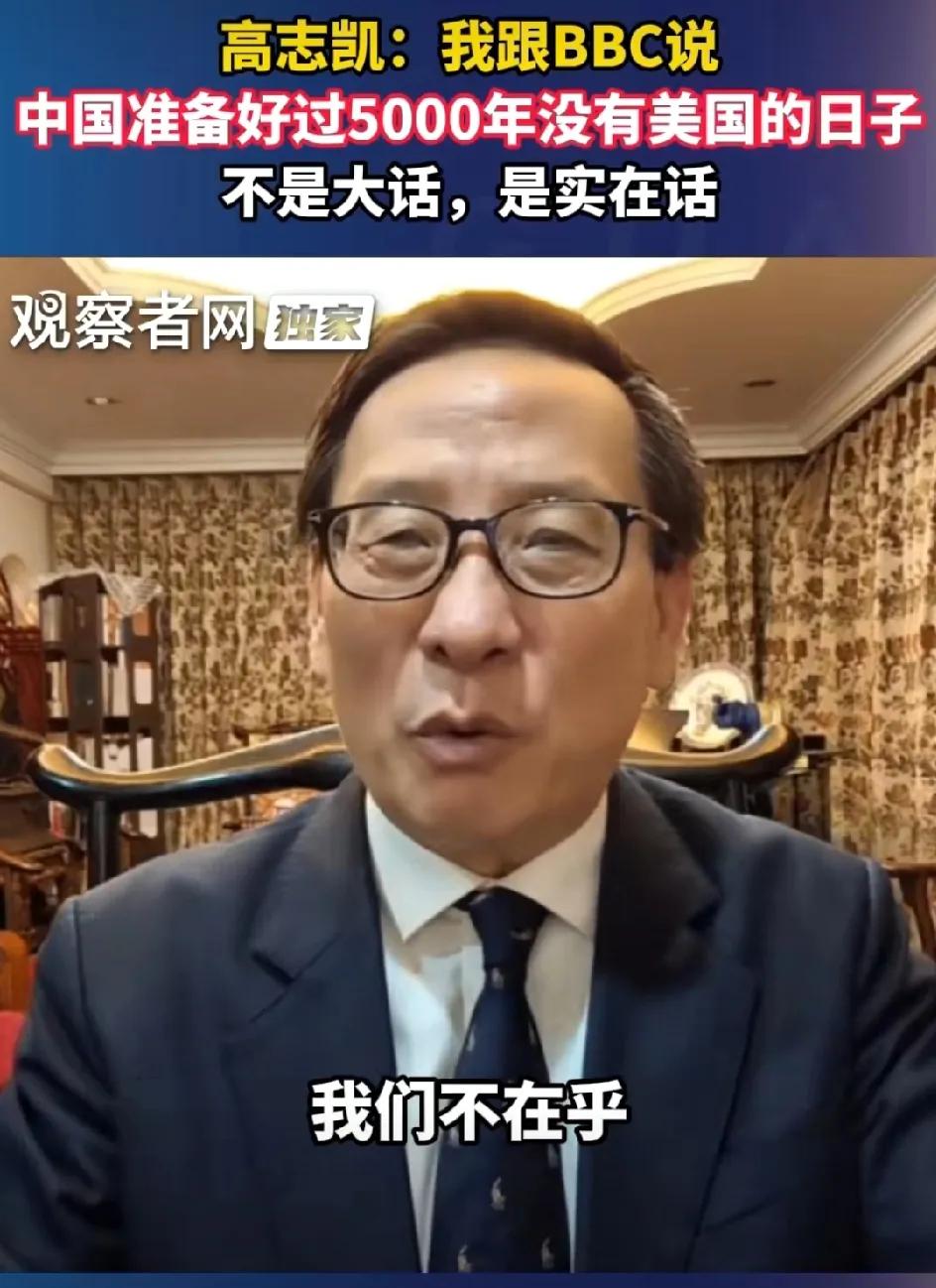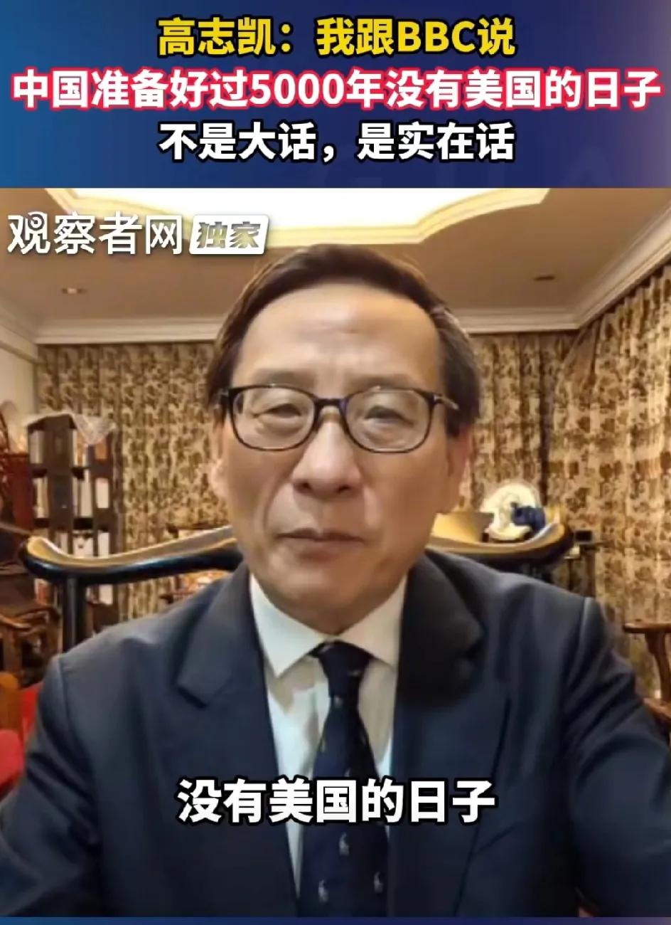 高志凯:中国已经准备好再过5000年没有美国的日子。这不是大话,这是实话。 美国向中国发动关税战最厉害的时候,BBC的记者问了高志凯一个问题。这个问题是:中国出口到美国的产品占中国总出口额的15%,如果这15%的市场全丢了,中国将如何应对? 他的言下之意,就是中国如果没有了美国市场,就会血流成河,溃不成军,经济崩溃! 对此高志凯给出的回答,可以称得上是石破天惊!也只有高先生这样的人,才能想得出如此既具有思辨性,又具有战斗力,同时又具有历史底蕴的回答来。 高志凯是这样回答BBC的记者的,他说:我们不在乎!中国已经存世5000年了,绝大部分时间没有美国什么事,我们照样活下来了。如果美国要欺负中国,如果美国要自绝于中国的话,那中国就做好准备,再过5000年没有美国的日子! 就问你高志凯的这个回答过不过瘾?解不解气?提不提神?爽不爽? 这个世界上,有没有美国对中国来说真的不重要。没有美国的那5000年,中国人照样创造了无数人类文明史上的辉煌。在接下来的时代,中国同样不会介意再过5000年没有美国的日子,甚至更长! 美国人,你听懂了吗?不服的话,只管放马过来,想打什么战,中国都奉陪到底!一定会让你知道如何做人!