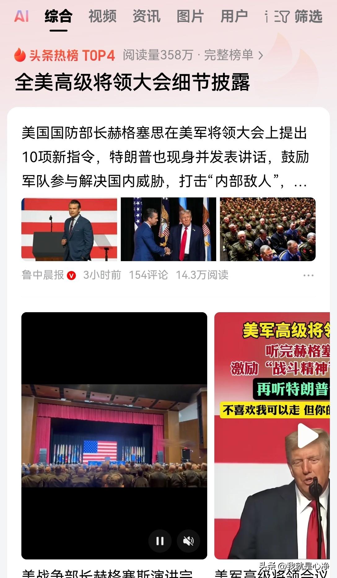 美国国防部长所召集的这次全球将军大会,最终变成了一场意识形态方面的整风运动。 并没有什么实际的战争准备,更多的则是特朗普和国防部长两个人在树立个人的权威。 烽火戏诸侯是为了掌控军队,杯酒释兵权也是为了掌控军队! 没弄成炮打庆功楼就已经很不错了! 这次将军大会,赫格赛斯一共演讲了45分钟。 而特朗普足足讲了70分钟,期间数百位将军并没有任何鼓掌互动,大会诡异的沉默! 那么这二位究竟讲了一些什么呢? 国防部长提出了十项指令,而这些指令更像是美国军队的内务新手册! 比如说不要lgbt,士兵要增加内务管理,不允许留大胡子。 不要大胖子,增加军队的战争意志,等等! 最关键的一点就是国防部长要求所有将军们都要对特朗普忠诚! 而特朗普更是天马行空,他从战舰的审美,一直聊到战舰要选不锈钢还是铝合金? 他表示所有的将军都可以随便的离场,随后又威胁,这些将军你们的职位有可能不保。 他从轰炸伊朗一直聊到了调停巴以冲突!然后就是抱怨拜登还有奥巴马这两位前总统! 当然了,还少不了对民主党的批判,更强调了自己派驻军队进入地方城市的合理性! 可以说这两个人的发言完全是混乱和无序的。 赫格塞斯的发言你或许还能找到一条主脉,而特朗普的言论完全就是天马行空,想说什么就说什么。 两个人更像是进行了一次不太成功的洗脑大会。 特朗普跟海格赛斯他们两个人考虑问题可能有点太理想化了。 看看台下坐着的这数百位将军吧,那可都是手握重权的地方军阀呀! 美国在海外大概有700个军事基地,按照惯例,每一座军事基地里最少要有一名将官。 大型军事基地里面将会有两名将官! 这也就是800名将军的数字由来了! 他们全都是封疆大吏,手握大权,控制着当地驻军的财政大权,还有人事大权。 并通过这些强大的武装力量,对军事基地周边进行有效的控制。 他们在军方早就形成了一个又一个的派系,而且跟国会内的实权议员们达成了同盟。 举一个很简单的例子,在中东地区美军基地里面的这些将军们,手眼通天对中东地区的控制力非常的强。 大家还记不记得美军偷叙利亚石油的新闻啊? 当时就有很多人不理解美国那么强大了,为什么还在乎那么几车石油呢? 其实那种黑产生意,直接受益人就是这些军阀! 他们偷走叙利亚的石油,然后一车又一车拉到伊拉克贩卖。 赚的钱可不是进入美国国库,而是进入他们当地驻军基地,这些高官们私人的小金库! 更不要说还有一些军火贩卖,还有一些暗网的生意了! 特朗普和赫格赛斯真的是在玩火,企图对这些军阀们进行洗脑,恐怕为时已晚啊! 这可不是二战罗斯福时期的美国了,而是一个被犹太资本完全腐蚀的美国。 看起来台下都是一个一个单独的人,但是在政治家的眼里,每一个人背后都是一个个大大小小的派系! 特朗普想要整合的实际上是这些派系的力量。 这也算一种内部的统战工作了,很不好搞的,难度不亚于一场内战! 当然了,如果特朗普赢了,那么他的权利完全可以堪比帝王。 如果他输了,这些军阀们也不会舍不得一颗子弹! 但是看这场大会上的表现,特朗普跟赫格赛斯并不具备一名改革家的能力!