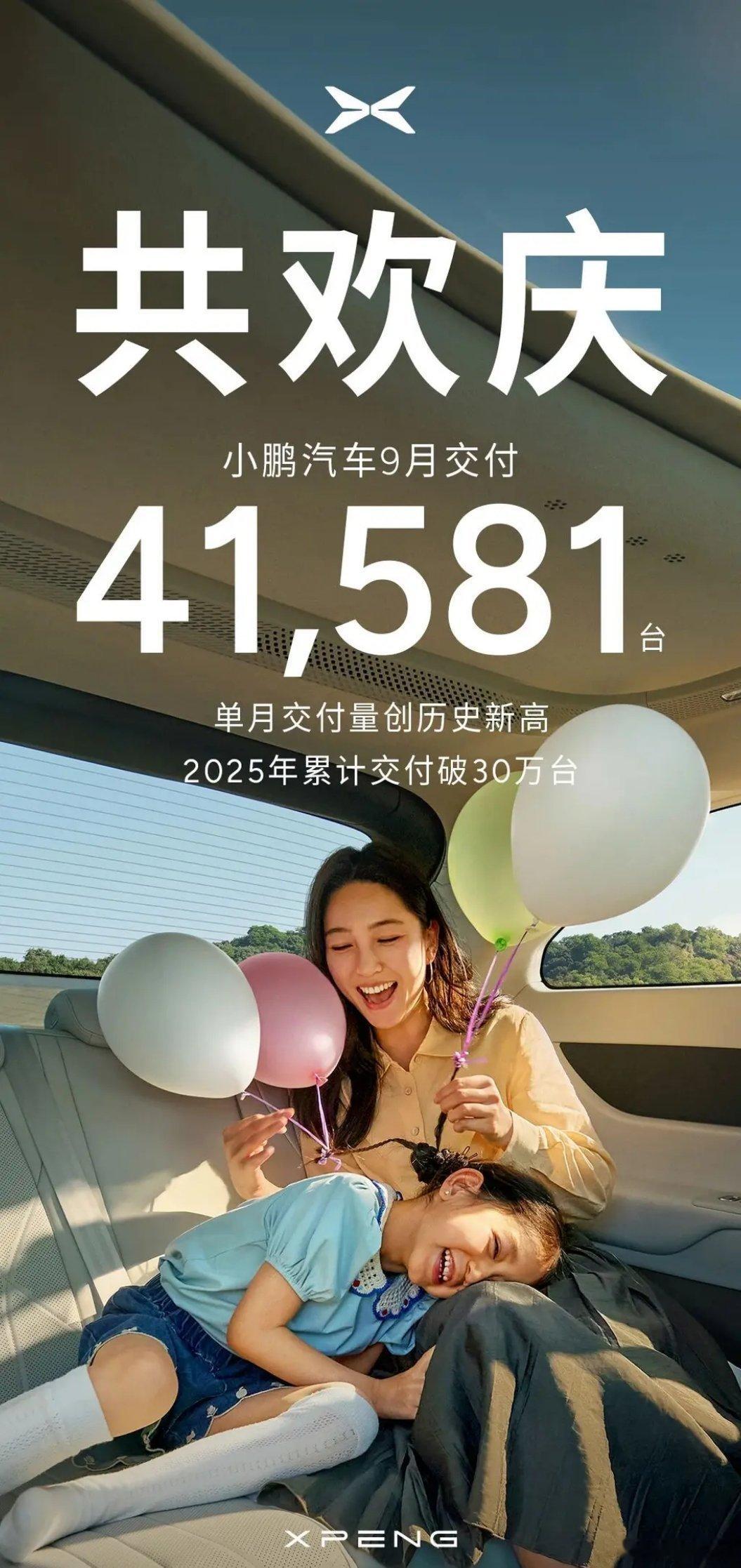 小鹏汽车9月交付41581台2025年累计交付破30万台。[点赞][点赞][点赞
