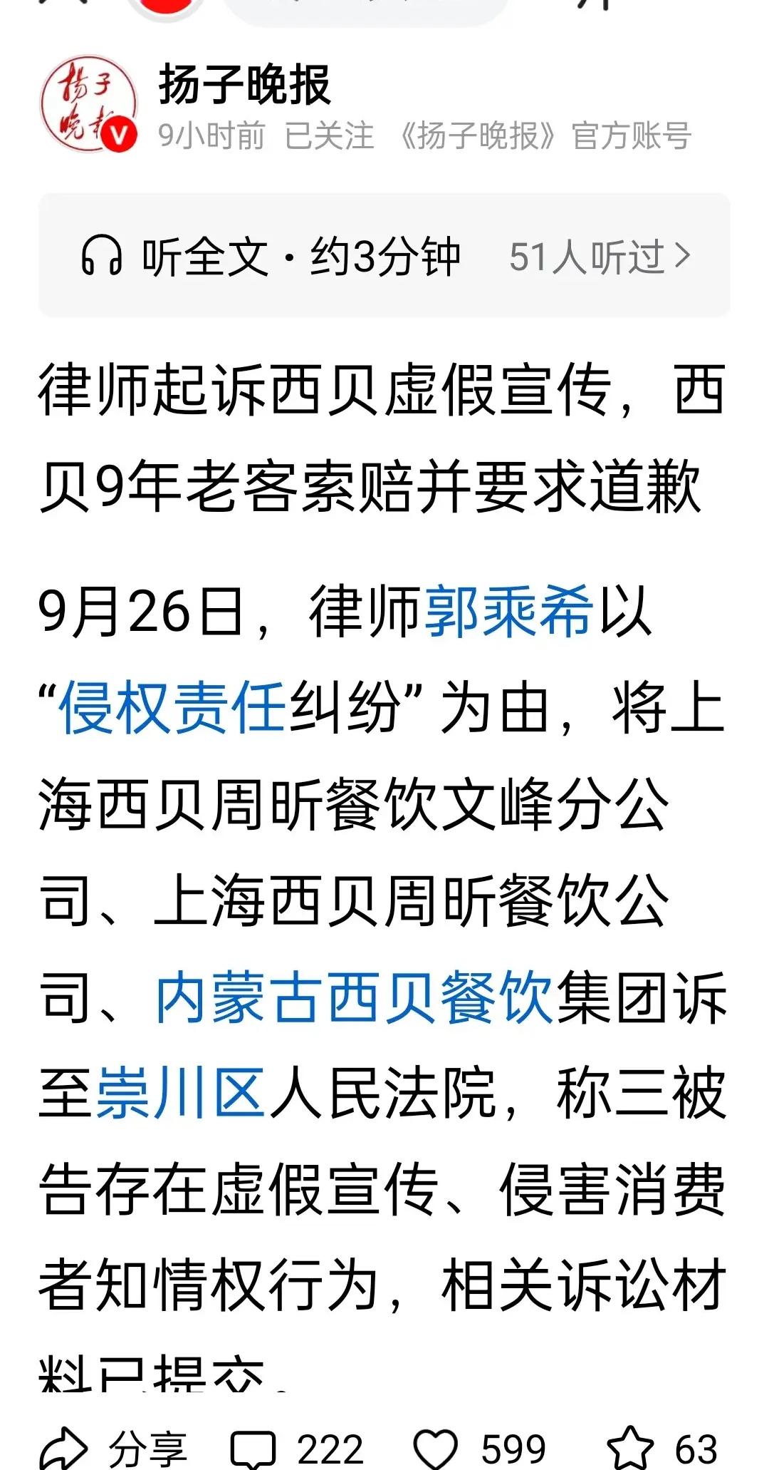 律师郭乘希正式起诉西贝,苏春莉喊话贾总起诉罗永浩! 这有完没完了? 这你来我往看似是各自安好,其实都是在把西贝往死里整!人家贾国龙都道歉了,帐号也清空了,还要咋的? 西贝9年老客律师郭乘希起诉西贝虚假宣传,索赔并要求道歉 9月26日,律师郭乘希以"侵权责任纠纷"为由, 告西贝存在 假宣传、侵害消费者知情权行为,相关诉讼材料已提交法院。 而这边苏春莉喊话贾总起诉罗永浩是因为老罗打着消费者权益的𣄃号干的是捏造事实、煽动情绪引流牟利的勾当,还说老罗不是简单的吐槽,而是有预谋的诽谤行为。 唉,这一天天的!真是忙坏了网友们! 这都咋办才是好。