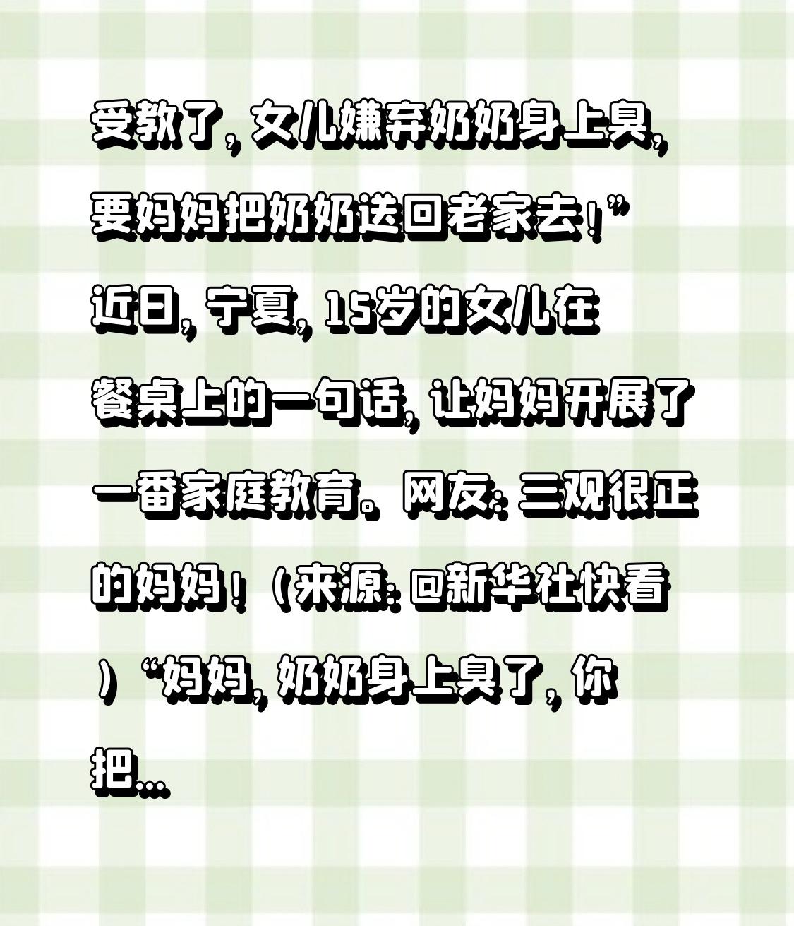 受教了!近日在宁夏,15岁女儿在餐桌上嫌弃奶奶身上臭,要求妈妈把奶奶送回老家,妈妈随即展开了一场家庭教育,获网友称赞:三观很正的妈妈! (来源:@新华社快看) “妈妈,奶奶身上臭了,你把她送回老家去吧。”吃饭时,女儿一脸嫌弃地对妈妈说出这话,想让妈妈把奶奶送回乡下。 妈妈听后十分震惊,停下了吃饭的动作。她沉思片刻,认真地对女儿进行教育:“你长大了,就有本事说这种话了?” “奶奶含辛茹苦把你带大,你现在却嫌她臭!以后我和你爸老了,你是不是也要嫌弃我们?”妈妈接着说道。 “在咱们家,尊老爱幼是底线。我对你提三个要求。第一,你马上给奶奶道歉,要直视奶奶的眼睛,真诚地表达歉意!” “第二,你要给奶奶洗手、洗脸,好好帮奶奶清理一下。第三,从今天起,奶奶房间的卫生由你负责打扫,去除奶奶身上的异味。咱们家不养娇惯的孩子!” 妈妈的话引发了网友热议。 “这是一位三观很正的妈妈!”有网友认为,孩子有不良言行时,应立即教育,告诉他们正确做法。 “现在的家庭教育愈发艰难!”也有网友表示,如今孩子衣食无忧,部分父母对孩子言听计从,让孩子养成了许多公主病。 的确,在我看来,对孩子的教育需及时进行,要让他们从小养成尊老爱幼、自食其力、孝敬父母等正确的三观和基本品德。 对此,你有什么看法呢? 对妈妈的评价 对妈妈的评评价 嫌弃孩子妈妈 被嫌弃的孙女 母女臭 臭女儿