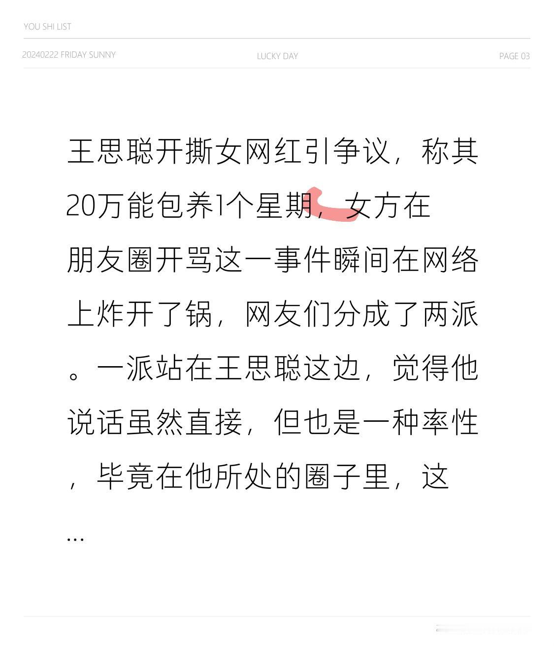 王思聪开撕女网红引争议,网红圈争议 王思聪和女网红 女方在朋友圈开骂这一事件瞬间在网络上炸开了锅,网友们分成了两派。一派站在王思聪这边,觉得他说话虽然直接,但也是一种率性,毕竟在他所处的圈子里,这样的消费观念或许并不罕见。他们认为女网红可能就是想借王思聪炒作,故意在朋友圈骂战,好提升自己的知名度。 而另一派则力挺女网红,指责王思聪言语太过侮辱人,不尊重女性。大家觉得无论财富多少,都不能如此贬低他人的尊严。女网红在朋友圈的开骂,也被看作是在维护自己的人格。 随着舆论的发酵,双方的亲友也开始卷入这场风波。王思聪的朋友站出来为他说话,试图解释这只是一句玩笑话,让大家不要过度解读。而女网红的闺蜜则在社交平台上晒出女网红平时努力工作、积极生活的照片,强调她不是那种为了钱不择手段的人。 这场看似简单的骂战,背后其实反映出了社会对于金钱、尊严和道德的不同看法。它就像一面镜子,让我们看到了人性的复杂和社会价值观的多元碰撞。不知道后续还会有怎样的发展,是双方握手言和,还是战火进一步升级,大家都在拭目以待。