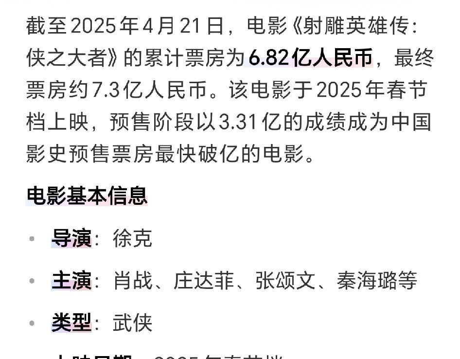一张票一万三也要看肖战,一百多位明星的晚会,只有他出现的时候亮起了红灯牌,也就是肖战独有的红海。还有一个梗,叫做“百家爬墙”,原来是2017年他还在少年团时,在演唱会上跳的一个舞蹈《极乐净土》,当时所有的网友都在弹幕上对自家的正主偶像说对不起,粉上肖战了。 都说春节档的电影《侠之大者》不好看,但票房也到了7.3亿。应该是春节档的几部电影太强劲了,有哪吒2,唐探1900,封神2,所有显得黯然了。
