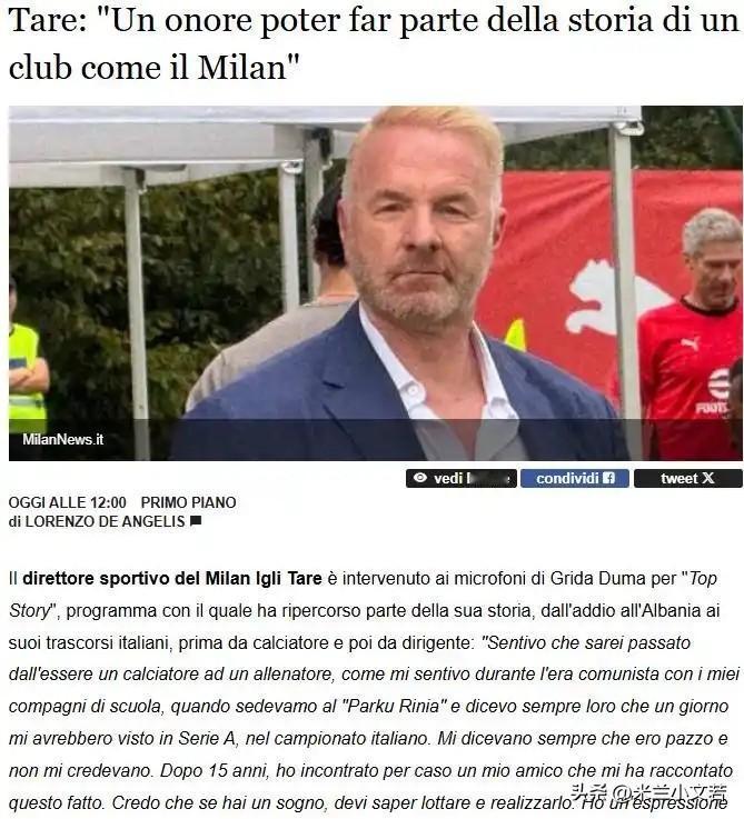 成为米兰的一员是我的荣耀。塔雷接受采访表示可以成为米兰的一员对我而言是一种荣誉。我从小就是米兰球迷,作为球员我很难加盟当年的米兰俱乐部,但作为俱乐部工作人员米兰认可了我的能力。 塔雷作为球员也是很不错的,曾经是巴乔的队友,他在中锋位置做墙,残血巴乔各种进球,记得那时候所有球迷都期待巴乔可以再次入选国家队圆梦世界杯,但当时意大利国家队主教练因为个人恩怨不愿意用巴乔。那时候因为要看巴乔,所以布雷西亚每场比赛只要时间不冲突就都会看,当时布雷西亚阵容和米兰阵容一样,几乎每个球员都了解。 塔雷作为球员到底咋样不好评价,但作为体育经理塔雷是非常成功的,塔雷加盟米兰的第一件事情就是取消了弗拉尼会计的弱智决定,取消了米兰主教练的工资禁制,所以米兰才有工资邀请阿莱格里,有了塔雷与阿莱格里本赛季的米兰才能有今天的表现。