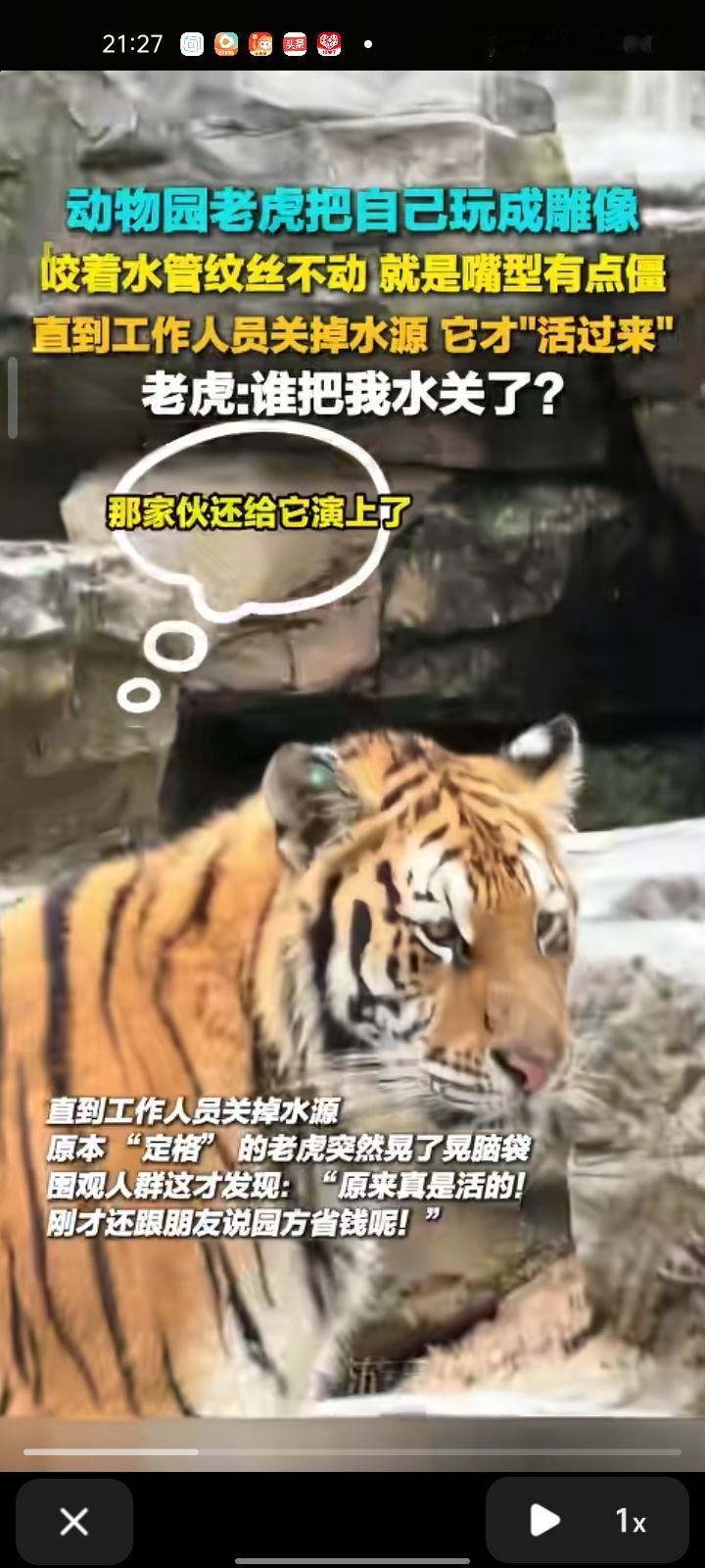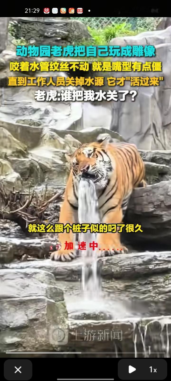 10月3日,洛阳市栾川县。网友发视频称,在动物园看到一只老虎叼着水管站在原地纹丝不动,直到工作人员关掉水源,原本“定格”的老虎突然晃了晃脑袋,围观人群这才发现“原来真是活的!刚才还跟朋友说园方省钱呢!” 老虎:我正想换个姿势,谁把我水关了