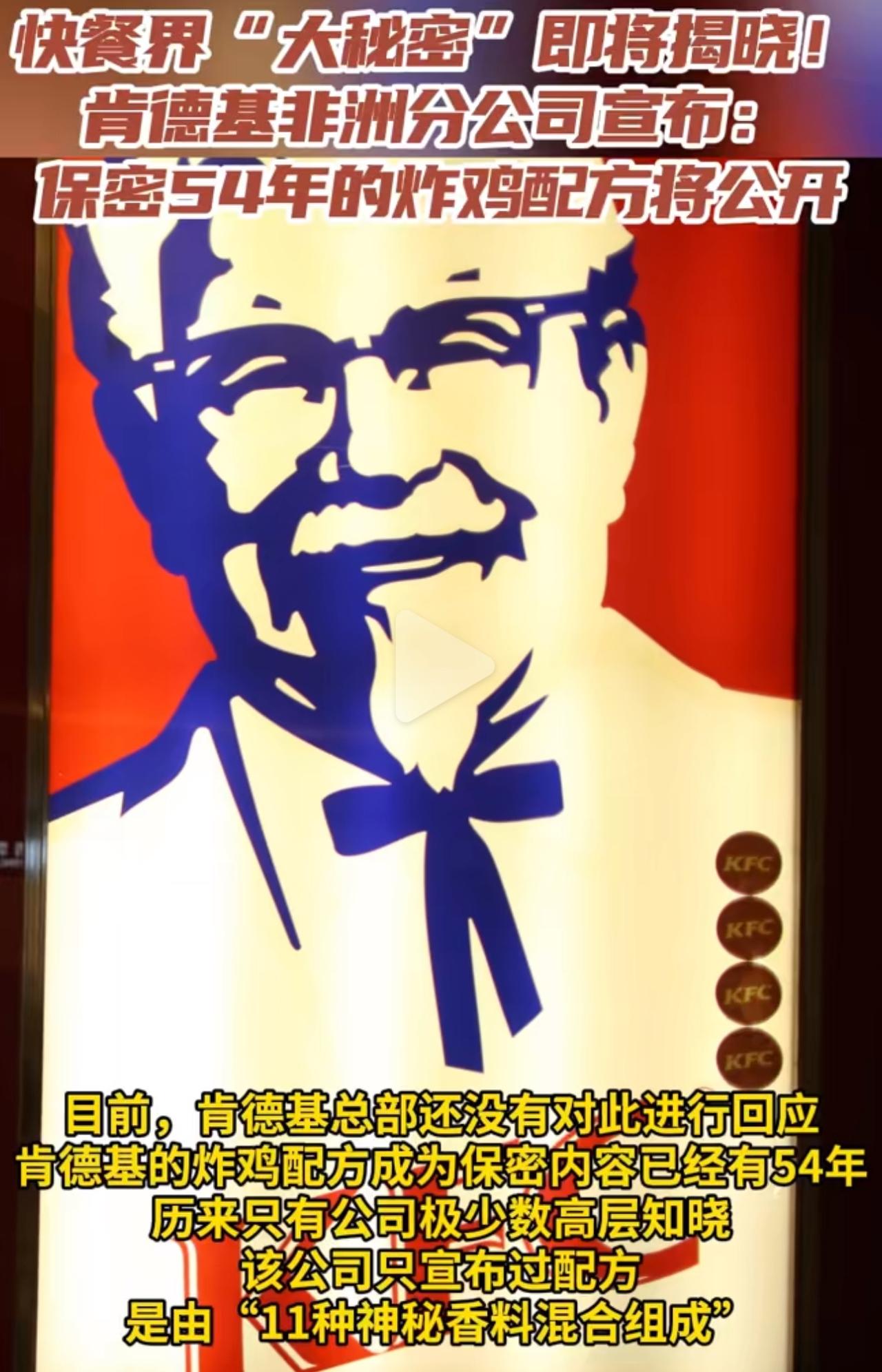 肯德基藏了54年的炸鸡秘方要公开?这波操作也太敢了吧! 10月3号那天,肯德基非洲分公司突然放了个消息,说10月8号就把那11种香料的配方给透出来。要晓得这方子以前多金贵,全球没几个高层能接触到,之前还在社交媒体上故意只关注11个沾着“香料”边的用户,把大家的胃口吊得老高。但奇怪的是,全球总部到这会儿还没动静,就这么沉默着,让人越想越不对劲。 网友瞬间就热闹起来,想尝鲜的已经在琢磨休息日买鸡翅试手,质疑的直接抛出来:“配方都给公开了,肯德基不得倒闭啊?”还有人喊着“先把蛋挞配方交出来更实在”。但更多人心里门儿清:这到底是真要交底,还是换个法子搞营销?毕竟非洲分公司那高管就说“历史会评判这招行不行”,这话听着就透着点猫腻。 就算真把配方亮出来了,咱普通人在家能做出那味儿?想都知道难。人家用的是打1940年传下来的工业压力炸锅,高温高压把水分锁得死死的,咱家里那口普通油锅根本比不了。更别说裹粉时得反复压、抖,炸完还得静置几分钟让汁儿匀一匀,哪步差一点,吃起来味儿就差远了。 非洲分公司敢把这层窗户纸捅破,说不定是跟总部没谈拢。但说实话,现在谁吃肯德基是冲那配方去的?咱吃肯德基不就图个干净省事,认准了那口啥时候吃都一个味儿嘛!10月8号一到就知道咋回事了,不管是真把配方亮出来,还是换个花样搞宣传,说实话,肯德基这波热度是赚得实打实的。肯德基 炸鸡秘方