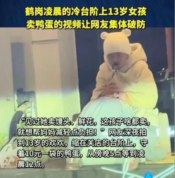 黑龙江鹤岗女孩欢欢深夜卖鸭蛋,让人一下子就想起了卖火柴的小女孩,这个几乎所有小学生都学过的课文,底层人生活的真实一面一百年了并没有远去和变过。 为什么深夜还在卖鸭蛋不回家?显然是生意不够好,没什么人卖鸭蛋,欢欢天真的希望延长营业时间,能等来需要鸭蛋的叔叔阿姨,这和寒冷的夜晚希望把火柴卖出去的小女孩并无差别。 这是一个不幸叠加不幸的家庭,父母早早离异,小女孩出生就有先天性心脏病,妈妈打零工维持生计,后面妈妈生病,只能偶尔打工,家里生活更加艰难。欢欢自幼身体不好,跑医院是家常便饭,妈妈仅有的收入还要拿出一部分给她看病。 这种家庭的环境,让欢欢过早懂事,体会大人的艰辛,开始努力去分担妈妈的压力。摆摊卖鸭蛋、鲜花等简单的商品,其中卖鸭蛋是一直坚持的,因为相比鲜花,鸭蛋耐储存,今天卖不完明天可以接着卖。价格稳定,利润有保证。 欢欢摆摊卖鸭蛋,她的事迹之前也有自媒体报道过,虽然引起关注,但是窘境并没有因此改变。10月国庆的第一天,她在街道边卖鸭蛋到半夜,被网友拍摄并发布,引起了鹤岗本地退伍军人路永庆等很多人的关注,筹集了3.5万元的医疗费送给她治病。 当地政府也证实了欢欢的家庭情况属实,鹤岗这个曾经因为房价低到尘埃而出名的地方,属于典型资源枯竭型城市,经济发展停滞,年轻人和不甘于现状的人都离开了。剩下的都是老弱病残,还有像欢欢这样的家庭,相信在这里远不止这一家。 要感谢热心网友的关注,欢欢的境遇有所改观,但是她以后的路还得靠自己和妈妈相互扶持着往前走,希望她爱看的《平凡的世界》能给她力量,做一个内心坚定,行为乐观的人,努力生活和学习,爱自己和妈妈。