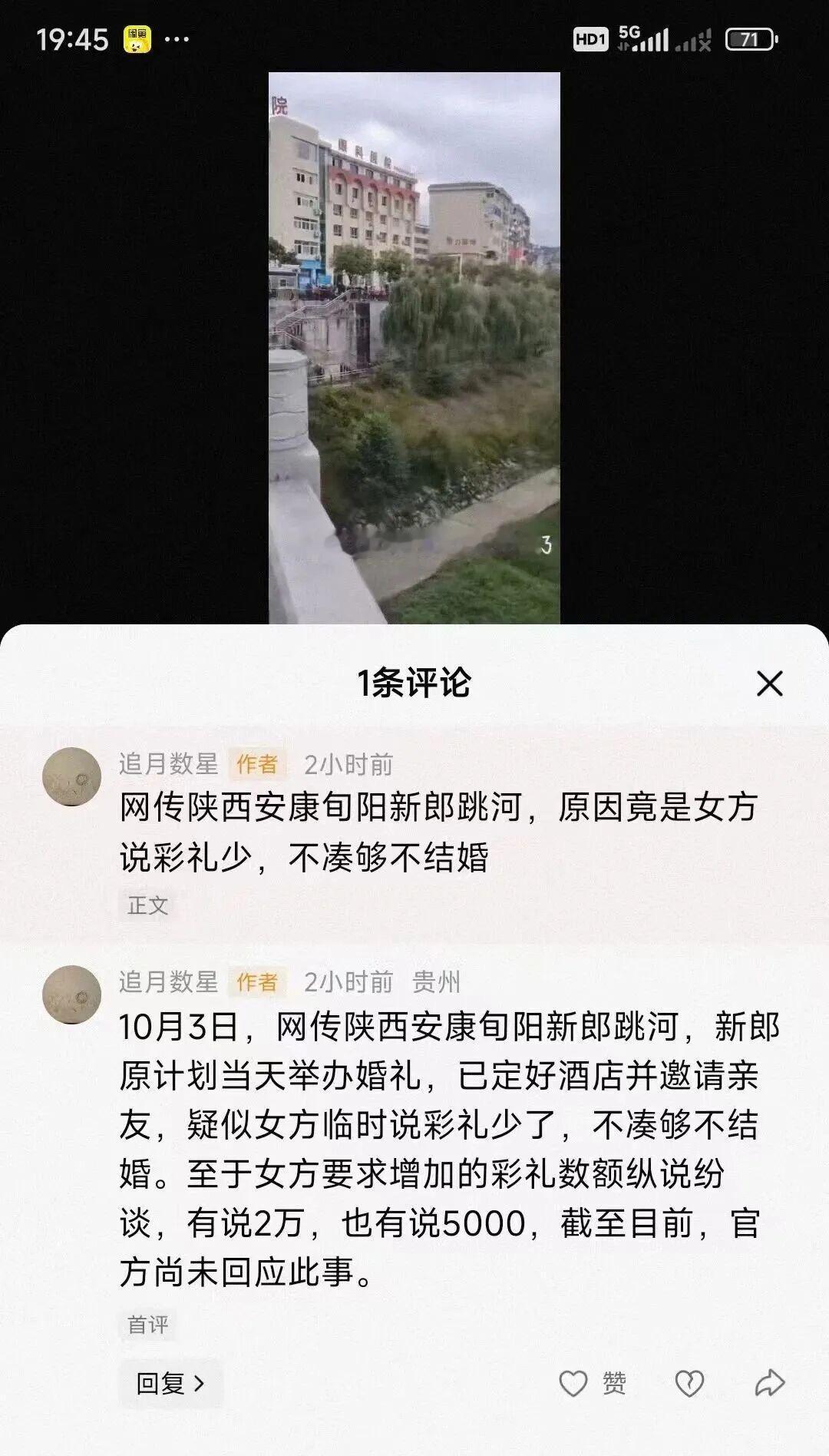 10月3日,陕西旬阳一新郎跳河自杀,知情人透露原因疑似彩礼被临时加价,新郎想不开,在婚礼酒店旁边的旬河跳河,生死未卜。 事情经过是这样的,新郎周某阳和新娘李某娟计划在10月3日中午举行婚礼,婚礼就选在旬河旁边的万达酒店,上午新郎去接新娘去酒店。结果新娘临时要加彩礼,有说是2万,有说是5千,这个突如其来的变化让新郎措手不及,因为在他们同意结婚之前已经给了女方20万彩礼,这时突然加钱,新郎一时拿不出来,新娘似乎表现比较强硬,钱不到位不下车。不知道中间到底还发生了其他什么,目前有待官方调查。 在酒店的宾客最后等来的是新郎跳河自杀的噩耗,当时在桥边的目击者证实,新郎跳下河后,人只冒了一下头,就被湍急的河水冲走。这几天当地连续下雨,河水深达五六米,水也非常浑浊,给救援带来很大难度。 又一起彩礼带来的悲剧,不免让人感到嘘唏长叹,婚姻已经变味了。普通家庭,为了支撑儿子成家,往往让年迈的父母背负重重的压力,把努力半生的积蓄甚至拉下老脸举债,去凑齐高额的彩礼。作为老实的儿子,对于父母的辛苦付出会感到内疚,有种深深的无力感,悲剧的发生往往就在悲愤之间。 跳桥自尽 江苏一男子跳河 湖南跳河事件