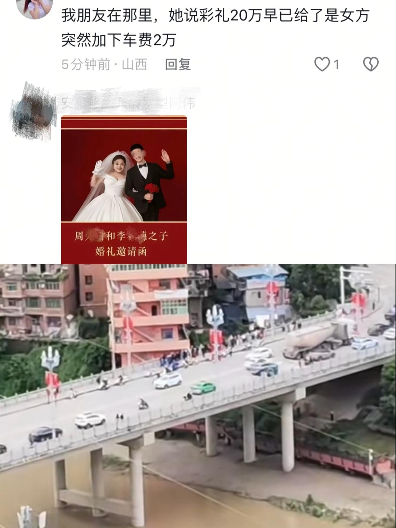 痛心呀,10月3日,陕西旬阳一新郎周某某婚宴当天从小河北桥上跳河身亡,据知情人透露,男子20万彩礼已给,新娘下车还要求2万,新郎拿不出来,一气之下跳河轻生,把一场喜宴变成了悲剧,彩礼本是一种仪式感的需求,根据自身条件来安排,而现在却变味了。