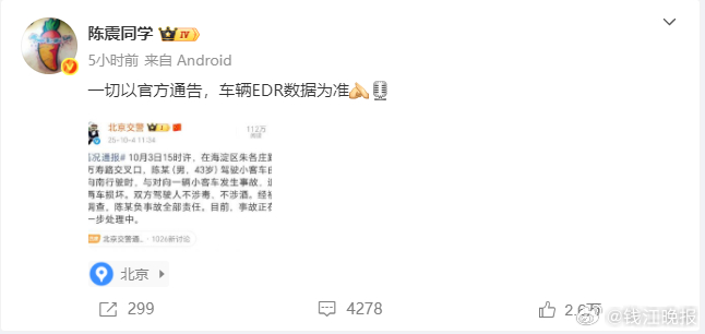 随后,陈震转发北京交警的该条微博并表示:一切以官方通告,车辆EDR数据为准。