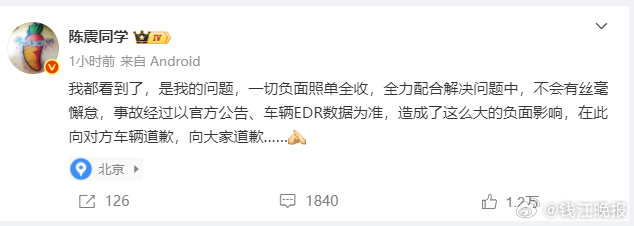 【#陈震致歉#:一切负面照单全收】#陈震称以车辆EDR数据通告为准# 10月4日下午,发文就车祸事件道歉:我都看到了,是我的问题,一切负面照单全收,全力配合解决问题中,不会有丝毫懈怠,事故经过以官方公告、车辆EDR数据为准,造成了这么大的负面影响,在此向对方车辆道歉,向大家道歉……