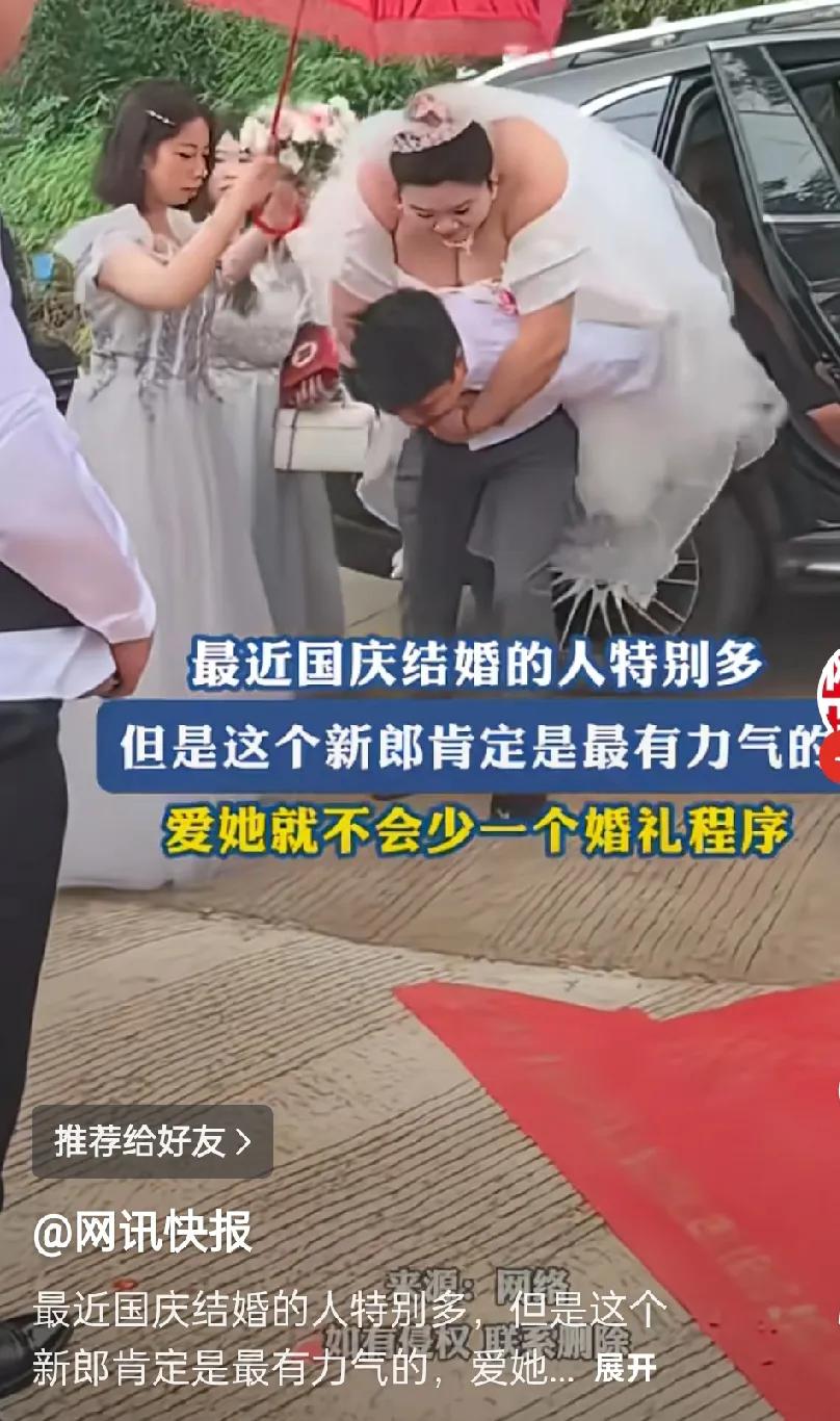 最近国庆结婚的人特别多 但这新郎肯定最有力气的 可不是,这可是货真价实的千斤啊 花同样的彩礼钱就应该娶个大号的! 新娘这体格,这长相绝对旺夫又镇宅,鼓励老公多赚钱,不然养不起她。这得吃多少啊,才能长得如此丰满,圆润! 她趴上去的那一刻,真怕新郎不小心闪了腰,把新郎累得脸都红了!女的是嫁得“真爱”,男的是娶得“真爱”! 祝他们百年好合,早生贵子!咳咳,虽然这体格有点困难!但是为了“真爱”,一切皆有可能!