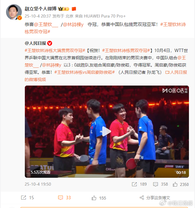 #王楚钦林诗栋男双夺冠#【#赵立坚恭喜王楚钦林诗栋男双夺冠#】10月4日,WTT中国大满贯男双决赛,中国队组合王楚钦/林诗栋以3∶0战胜队友组合周启豪/陈俊菘 ,夺得冠军。