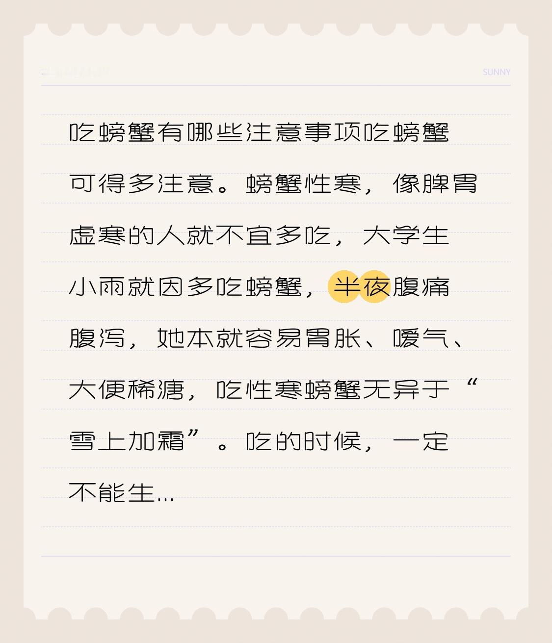 吃螃蟹有哪些注意事项 吃螃蟹可得多注意。螃蟹性寒,像脾胃虚寒的人就不宜多吃,大学
