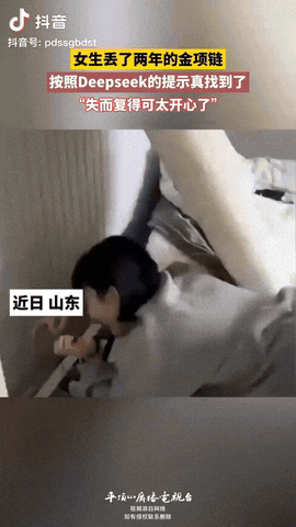 山东,一女子两年前丢了一条金项链,怎么找都找不到,然后就放弃了,如今DeepSeek上线,女子灵机一动,就借用“D老师”的提示,帮忙找一下那条金项链,没想到的是,结果她真的找到了。 信息来源:平顶山广播电视台 小玲(化名)当初天天翻衣柜、掀沙发,连床头柜都没放过,还是没找到那条陪伴她多年的金项链。 要不是上个月朋友圈刷到有人用AI找回身份证,她都快忘了有这么回事儿。 三月初,她下载了DeepSeek App,一脸试探地在输入框里敲下:金项链两年前丢了,在家找过这些地方〔她一条条写下衣柜、梳妆台、沙发底……〕。 点了“开始分析”,手机屏幕上飞快跳出一串建议:鞋盒、门后、窗帘夹缝……最醒目的一条竟是“床垫与床架缝隙”。 小玲当时还嘀咕:“这都想得到?!” 但想想也没坏处,就把床往墙边一推,一掀床垫,手指刚伸进去,就摸到那抹熟悉的金光。 两年遗憾,一秒化作喜悦,差点没把项链当葱挥。 有意思的是,DeepSeek可不光是靠大模型算命那么简单,它背后连着家里的摄像头、Wi-Fi路由器,组成了一个“数字感知网络”,再配合图像、文字、环境数据一起分析,定位还挺准。 它还宣称所有数据传输都加密,保护咱们的隐私安全。 不过,目前没有国家级权威认证它真能给你追踪实物,别太当真——如果真丢在小区外、街上,它也没法儿帮你捡回来。 小玲事后在朋友圈发了张照片,瞬间就刷爆了,好几个人留言说:“我也要试试,看看是不是能找回我那堆乱七八糟小物件!” 还有人笑着问:“我的前任能不能也帮我找回来?”总之大家都觉得又神奇又好玩。 其实,这件事告诉我们:如果东西丢了,大多数情况不是飞去哪儿了,而是藏在某个你想不到的角落里。 DeepSeek是给我们提供全面的提醒,它真的把平时容易忽略的地方都罗列出来,省了不少功夫。 所以,科技来源于生活,也用于生活,而不是给大家变魔术,而是帮我们用新的思路去看问题,有时候换个思维,很多问题就迎刃而解了。