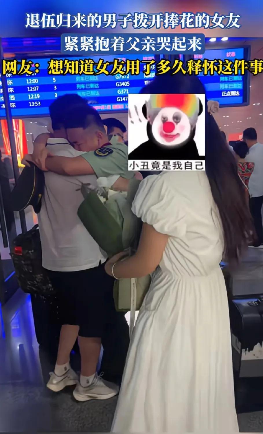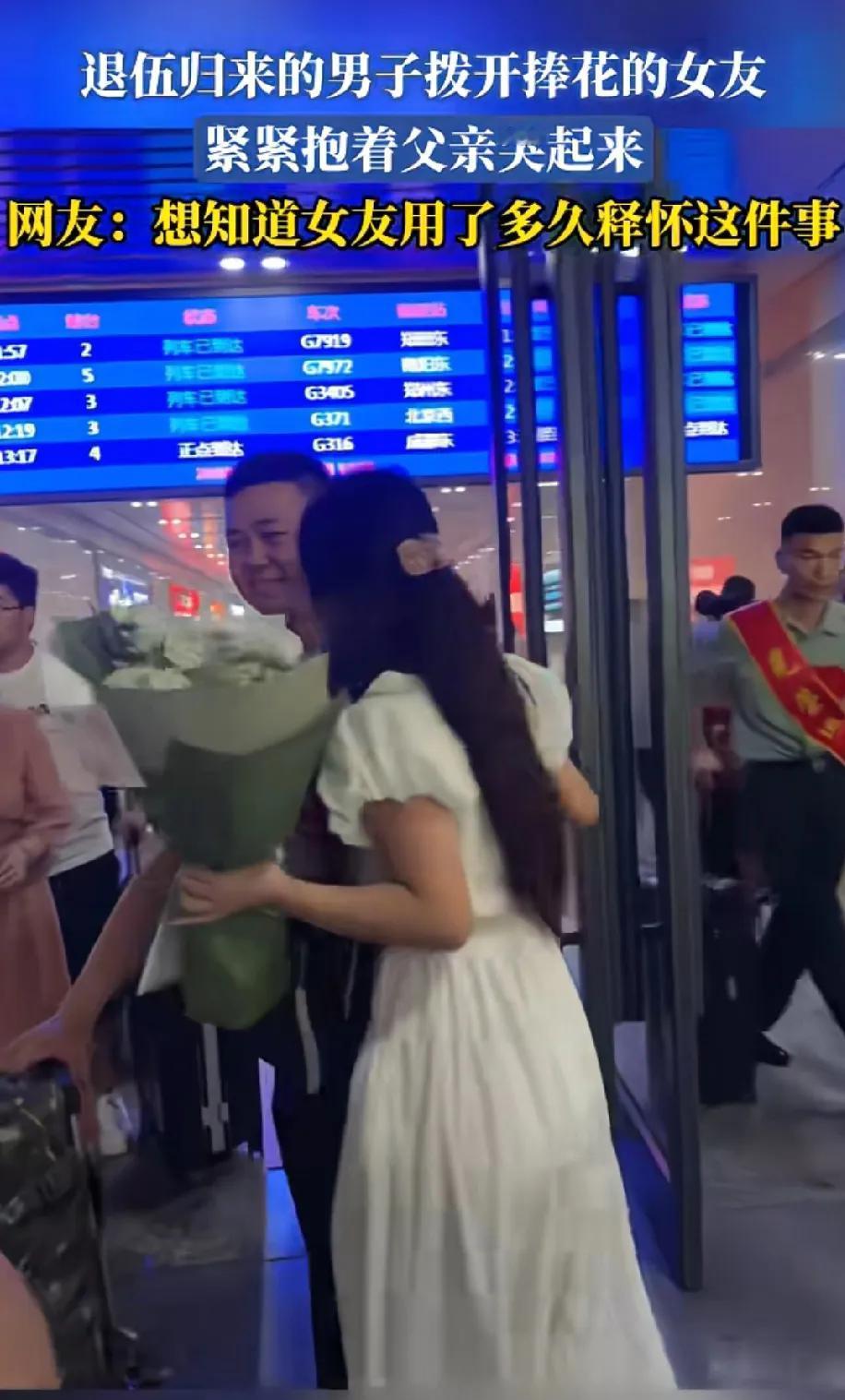 退伍归来的男子拨开捧花的女友 却紧紧抱着父亲哭起来 这情商真是低得不止一点 女友等他这么久,并且第一个上前迎接他,手都展开了,男子顺势抱一下,再去抱父亲不好吗,也不耽误父子情深啊?为什么要让女友尴尬呢? 当然,还有一种可能就是不爱,毕竟爱不爱动作表现得出来。建议女友重新考虑一下这段关系,这种还是不要嫁了,以后啥都靠边。