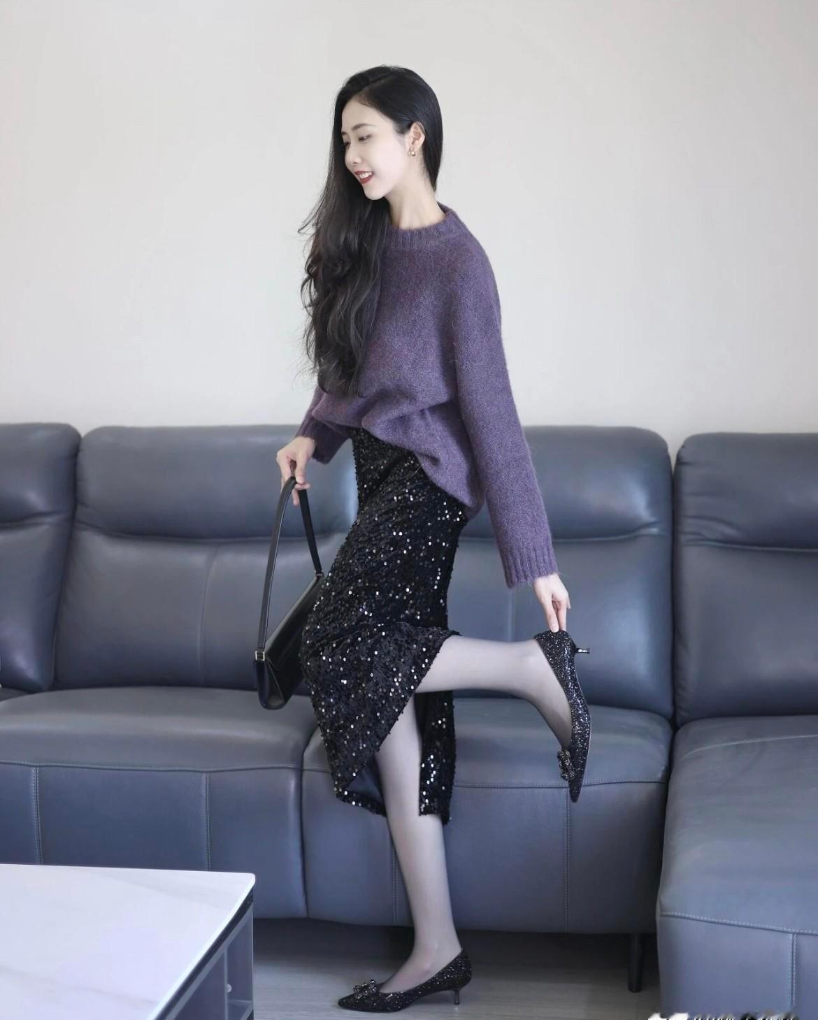紫色毛衣配亮片裙,不是为了上台,是让你下班后还能被多看两眼。 Pantone把这紫定成“神秘兰花”,不是瞎起名——黄皮穿它像打了柔光滤镜,白皮穿它像刚从油画里走出来。 天猫搜“紫色针织”月涨142%,不是博主带火的,是普通人发现:这颜色不挑人,还显瘦。 毛衣别选紧身的,落肩+箱型,肩线往下掉3厘米,小个子瞬间有气场。 亮片裙必须带里衬,不然走路像披了铁皮,扎腿不说,还容易勾丝。 别怕低调,黑丝选20D半哑光,亮片不炸,质感才稳。 通勤穿它? 外搭一件灰西装,裙摆漏8厘米,领导看不见亮片,同事偷偷拍照。 夜游别穿丝袜了,蕉内那款“肤光神器”+银腰链,手机一拍,你就是城市夜景的C位。 艺术展别拎大包,COS那个雾面小牛皮风琴包,收起来比手机大不了多少,打开能塞两本画册。 洗的时候别手搓,扔进内衣袋,冷水一转,晾的时候倒挂,别晒太阳——亮片不是钻石,经不起折腾。 这身不是穿搭,是2025年女人的隐形盔甲:不吵不闹,但一出现,你就知道,她没打算被忽略。