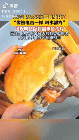 浙江杭州,一女子用牙咬大闸蟹腿牙裂了,连喝口温水都跟电击一样,然后去医院看医生, 经过医生检查后,牙出现了明显的隐裂,需要进行根管治疗。 信息来源:半岛晨报 眼下正值2025年9月底到10月初,第一批大闸蟹刚上市,杭州市好几家医院口腔科几乎每天都能接到1到3例类似急诊。 李女士就是其中之一,她嫌麻烦,没用“蟹八件”工具,就直接用牙咬壳。 没咬几下,就听见“咔”一声,痛得直跺脚,连喝口温水都跟电击一样,赶紧跑到浙江省立同德医院口腔科,医生一看,右上后牙有条肉眼看不清的裂纹,深入到牙本质甚至快碰到牙髓了。 原来蟹壳和牙釉质都差不多硬,用牙咬就是“硬碰硬”,点状受力能跑到150-200兆帕,远超牙釉质抗折强度。 再加上牙齿本身有点高尖、旧牙以前补了,裂纹瞬间就扩散开来了。 一旦碎到牙本质小管或牙髓,冷热、咸咸淡淡的唾液稍微一碰,就像扎针一样。 不仅李女士,绍兴、南京等地的口腔急诊都跟着大闸蟹销量一涨(有的地方一周内涨了600%),就诊人数也蹭蹭增。 医生提醒,咬到某一点剧痛、冷热刺激才是真危险,得在24小时内赶紧去看牙,0–72小时是保住活髓的黄金窗。 光靠脱敏糊牙膏可不够,轻的树脂封闭,重的脱敏+戴全冠,不治就只能根管治疗,最糟还能直接拔掉。 通过这事给大家提个醒:大家不要嫌弃麻烦,吃蟹就用“蟹八件”,别拿牙当工具! 平时也别拿牙开瓶盖、啃冰块、直接咬坚果或撕塑料包装袋,这些坏习惯都会伤害牙齿。 所以大家平时要保护好自己的牙齿,注意口腔卫生,虽然吃蟹很美味,但是要记得护牙,别图省事,最后花钱花时间又遭罪,吃亏的还是自己。